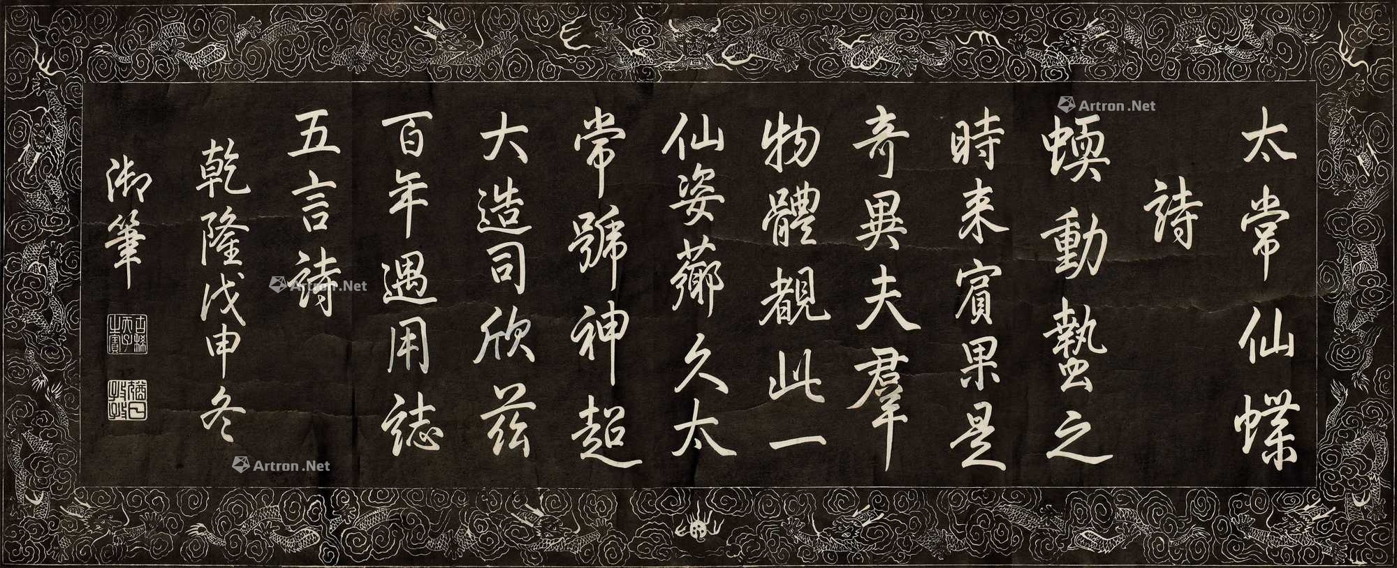 内府陈设本《御制太常仙蝶诗》,紫檀帖匣雕刻极其精美,明黄地江崖海水天鹿文缂丝包首,轴是白玉的,青玉的别子,八宝系带。这个带子绕一圈半正好别到签和天杆之间。这是内府特有的装帧规矩。里面亮墨精拓,富丽堂皇。这么高规格装帧在内府中也是极为少见的。
