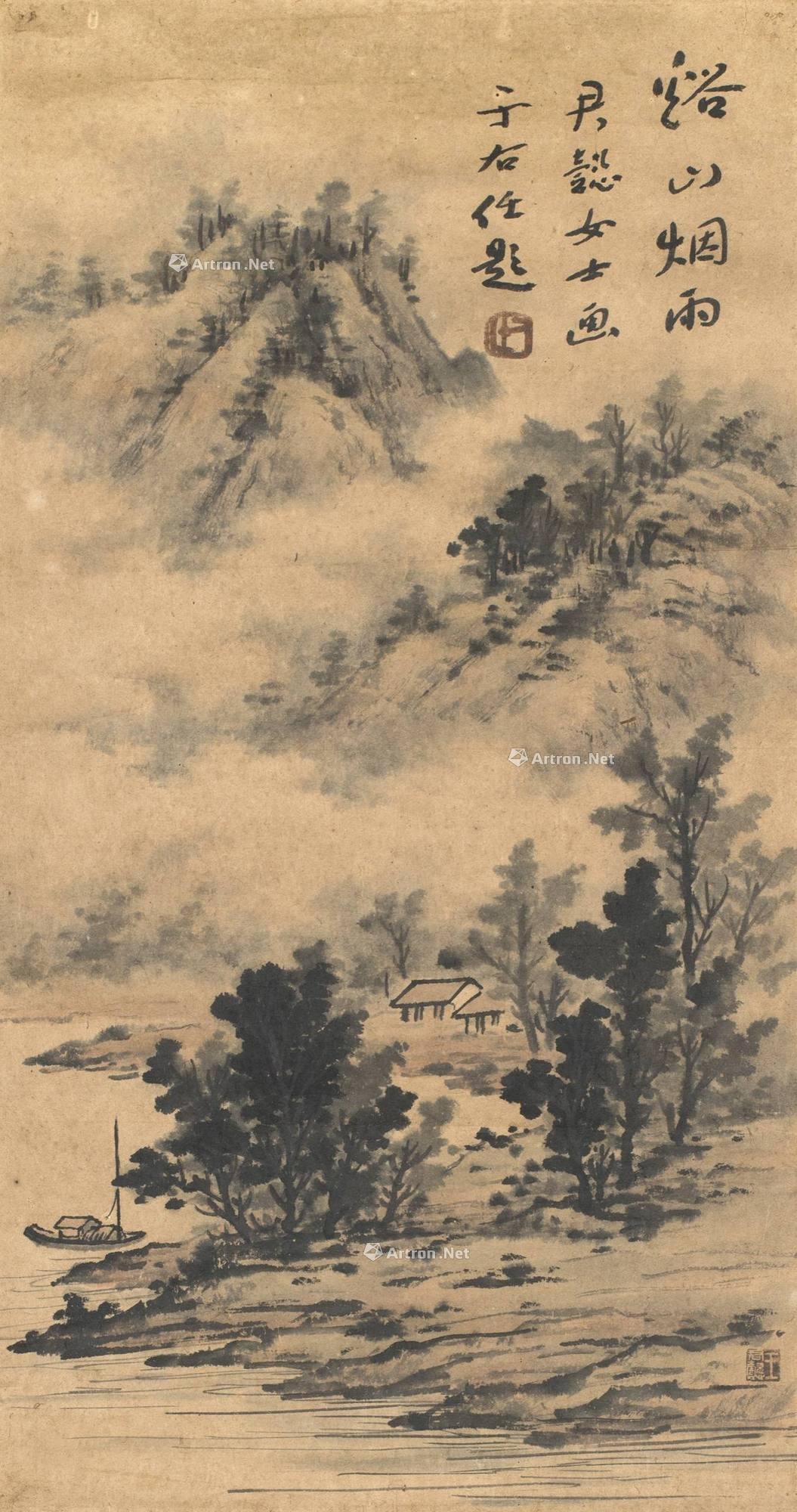 款识:年来作计笑疎迂,爱写倪家淡墨图,心似孤篷随去住,一窗寒雨梦江湖。甲辰六月二日,实君老弟过余冬华盦,茗谭清适因及考父先生高风大雅窃深慕焉,先生且以拙墨见索于实君,盖过信吾友小松之虚誉耳。时余卧疴方起,弱腕不振漫尔,仿迂叟秋林野兴图并录旧作为赠,他日小松见之当发一笑也。蒙泉外史奚冈识。