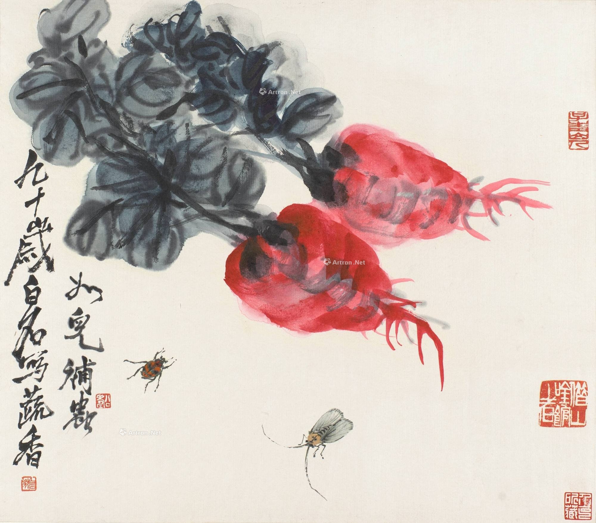 出版:《近现代中国画名家──齐白石》,上海书画出版社,2008年1月第1版,P.183。 著录:《中国书画家印鉴款识 • 齐白石》,文物出版社,1987年,第26号,钤印「老白」,页1380;及第91号,款识「白石齐璜」,页1387,即取自本幅。