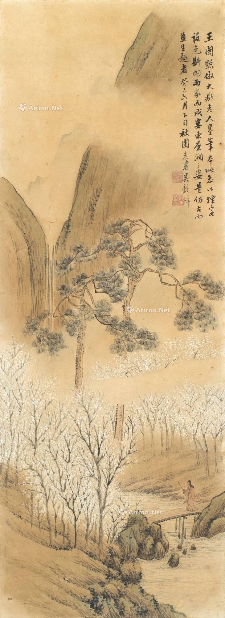 款识:杨岘题签:归老显亭图。 归老显亭图,显山高入云,中有显亭长,星霜别来久,远作归与想,行年七十五,健步不殊曩。常抱石酒尊,醉倚碧松上。烦浊风洗涤,视听烟莽苍。鉴影碧浪俯,感旧榆楼仰。风味我遥忆,画毕把自赏。赋诗重行行,看策先生杖,癸已四月维夏,藐师命写略拟黄秋盦用笔蕲诲正,门下吴俊卿并题句。
