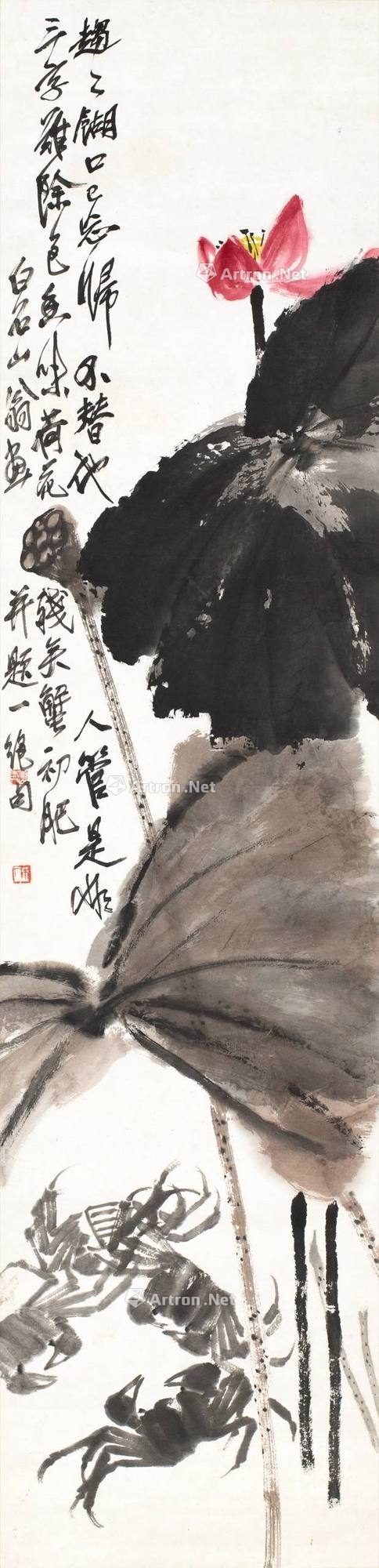 款识:趋之糊口已忘归,不替他人管是非,三字难除色香味,荷花残矣 蟹初肥。白石山翁画并题一绝句。