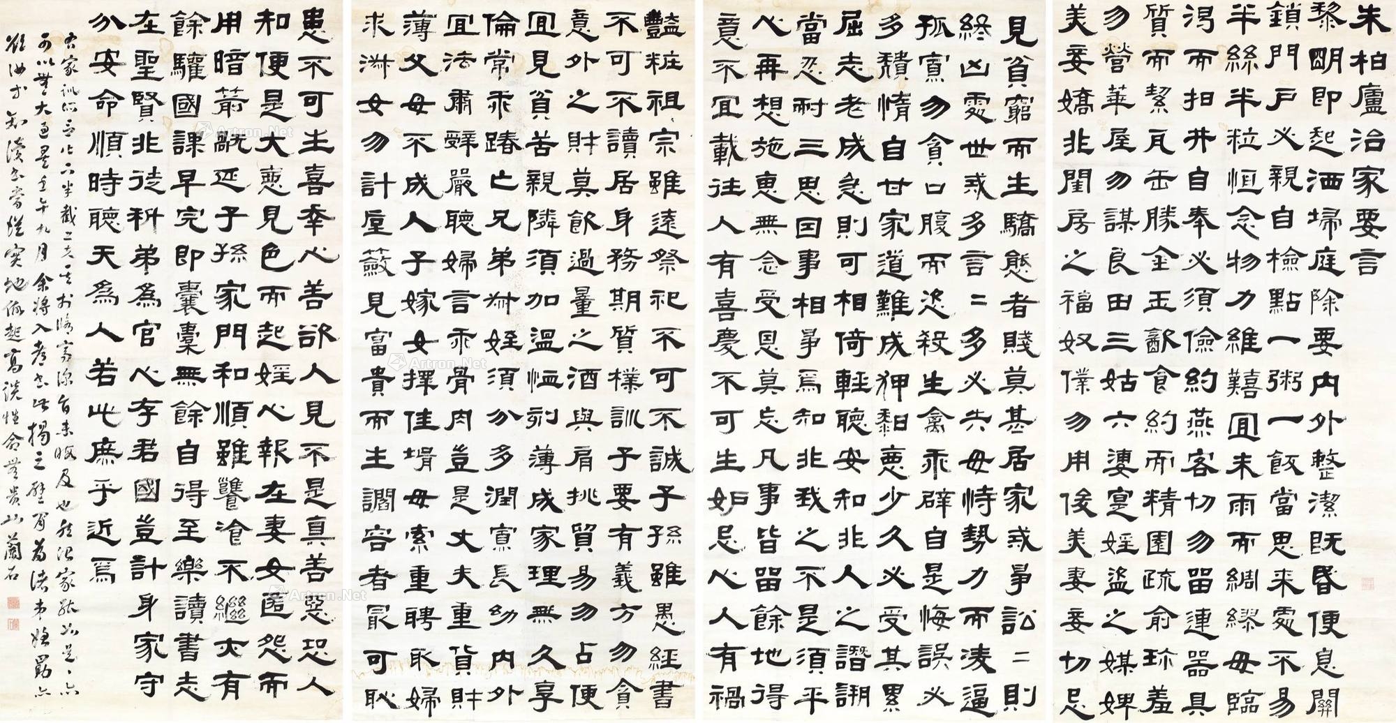 款识:朱柏庐治家要言黎朙即起,洒埽庭除,要内外整洁。既昏便息,关锁门户,必亲自检点。一粥一饭,当思来处不易.半丝半粒,恒念物力维囏。宜未雨而绸缪,毋临渴而抇井。自奉必须俭约,燕客切勿留连。器具质而絜,瓦缶胜金玉。饮食约而精,园疏俞珍羞。勿营华屋,勿谋良田。三姑六婆,寔淫盗之媒.婢美妾娇,非闺房之福。奴仆勿用俊美,妻妾切忌艳妆。祖宗虽远,祭祀不可不诚.子孙虽愚,经书不可不读。居身务期质朴,教子要有义方。勿贪意外之财,勿饮过量之酒。与肩挑贸易,勿占便宜.见贫苦亲邻,须多温恤。刻薄成家,理无久享.伦常乖舛,立见消亡。兄弟叔侄,须多分润寡.长幼内外,宜法属辞严。听妇言,乖骨肉,岂是丈夫.重资财,薄父母,不成人子。嫁女择佳婿,毋索重聘.娶媳求淑女,毋计厚奁。见富贵而生谗容者,最可耻.遇贫穷而作骄态者,贱莫甚。居家戒争讼,讼则终凶。处世戒多言,言多必失。毋恃势力而凌逼孤寡,勿贪口腹而恣杀生禽。乖僻自是,悔误必多.颓惰自甘,家道难成。狎昵恶少,久必受其累.屈志老成,急则可相依。轻听发言,安知非人之谮诉,当忍耐三思.因事相争,安知非我之不是,须平心暗想。施惠勿念,受恩莫忘。凡事当留余地,得意不宜再往。人有喜庆,不可生妒忌心。人有祸患,不可生喜幸心。善欲人见,不是真善.恶恐人知,便是大恶。见色而起淫心,报在妻女.匿怨而用暗箭,祸延子孙。家门和顺,虽饔飧不继,亦有余欢.国课早完,即囊橐无余,自得至乐。读书志在圣贤,为官心存君国。守分安命,顺时听天。为人若此,庶乎近焉。右家训所言非只半截工夫,其于修富深旨未暇及也。然谓家能如是,是亦可以无大过矣。壬午九月余将入都,书此揭之壁间,为诸弟妇勖,亦欲汝知:读书当从实地做起,高谈性命无贵也。兰石。