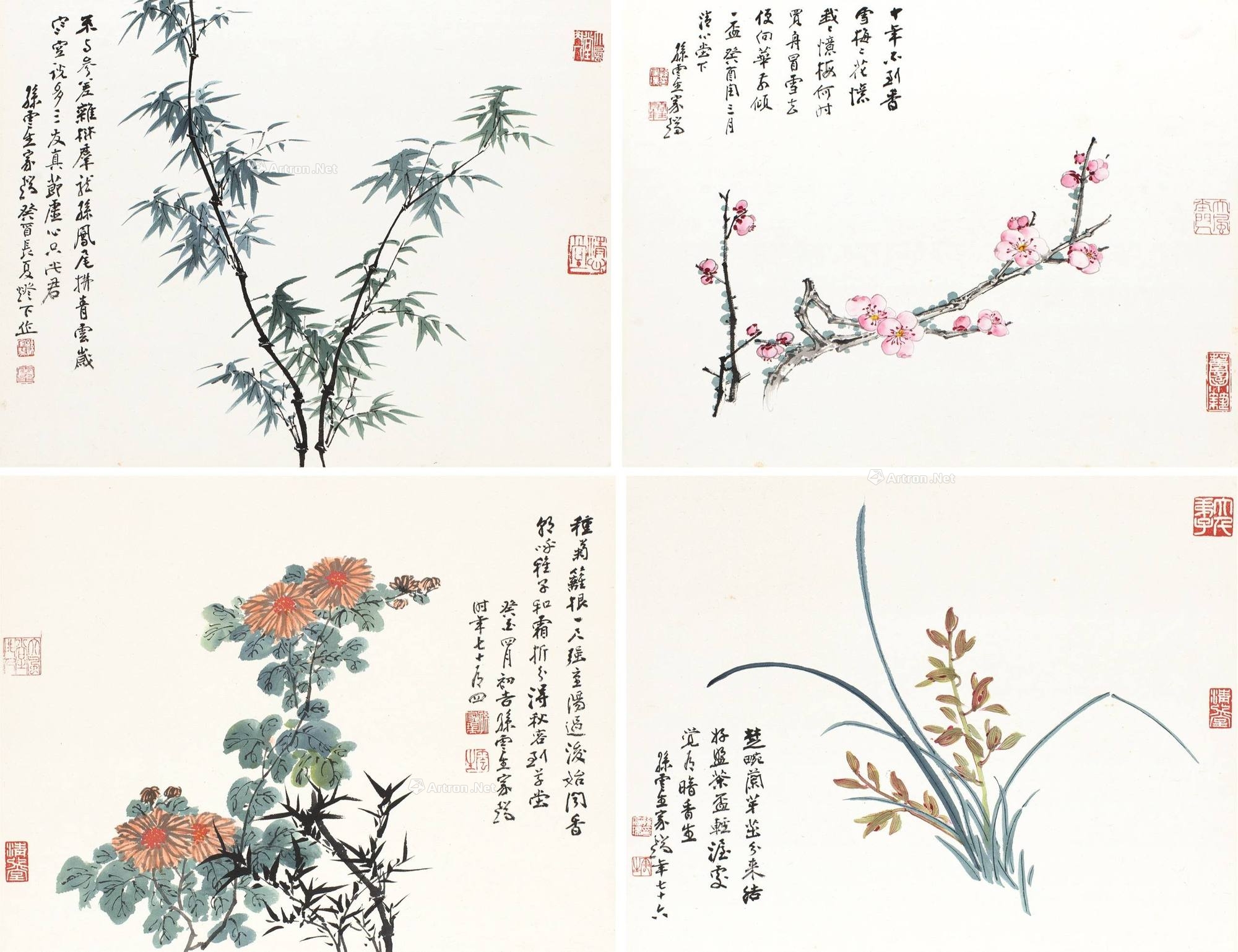 款识:十年不到香雪梅,梅花忆我我忆梅。何时买舟冒雪去,便向华前倾一杯。癸酉闰三月清下。孙云生家瑞。楚畹兰芽茁,分来结好盟。茶杯轻渥处,觉有暗香生。孙云生家瑞年七十六。不与参差杂树群,龙孙凤尾拂青云。岁寒空说多三友,直节虚心只此君。孙云生家瑞癸酉长夏灯下作。种菊篱根一尺强,重阳过后始闻香。朝呼稚子和霜折,分得秋客到草堂。癸酉四月初春,孙云生家瑞时年七十有四。