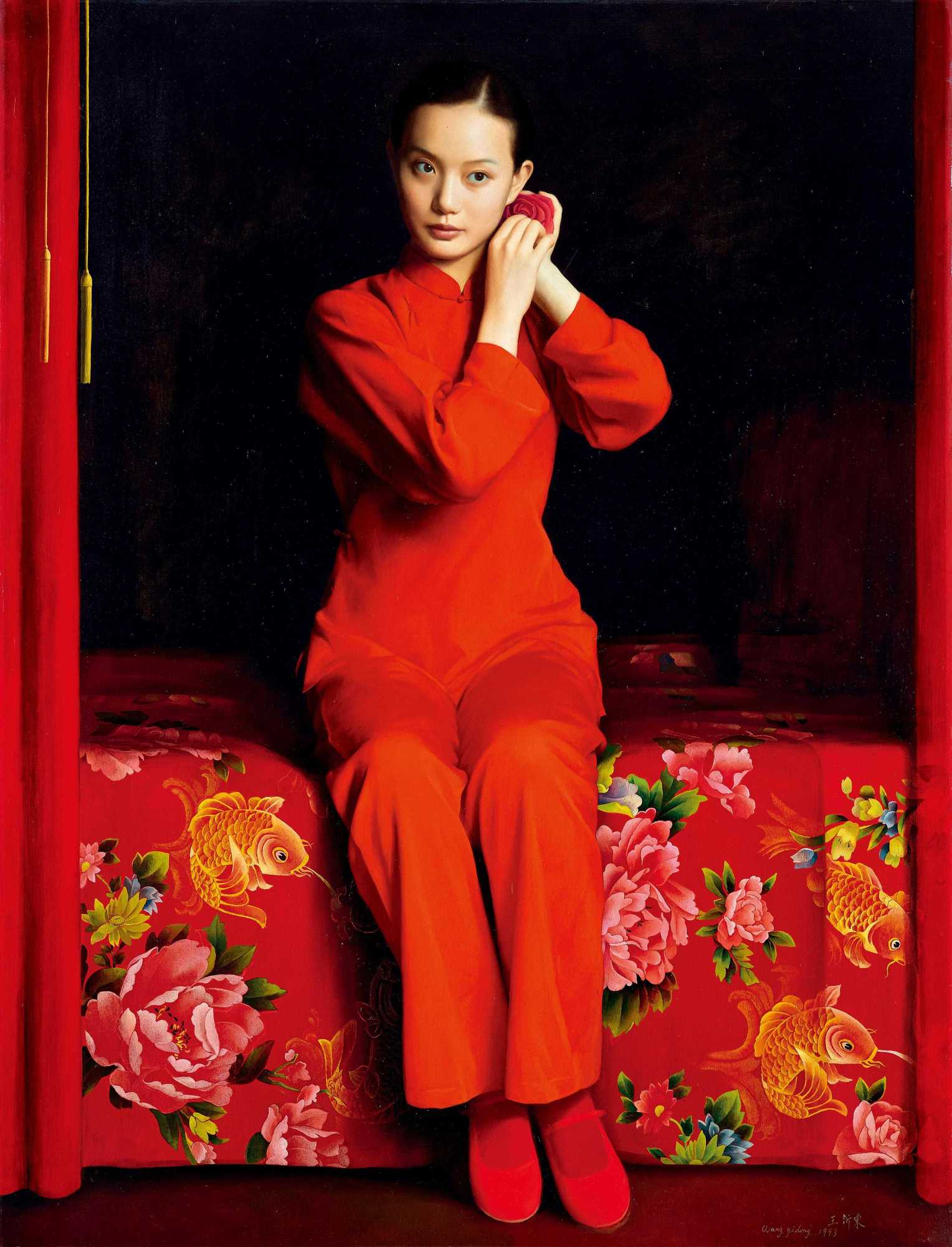 王沂东《新娘》以175万港元落槌,210万港元成交。本作主角端坐婚床,双手轻扶乌发间的红花,双腿含蓄地并拢,微微颔首,凝神含羞,尽显东方女性的温婉与内敛。艺术家以其标志性的“中国红”贯穿画面:女子的嫁衣、花饰,至婚床与帘幕,无不施以饱满绚烂而富有层次的朱砂色,既成为其作品的视觉核心与个人标记,更唤起观者对中国源远历史文化之怀想,赋予作品深切的民族情感。深蕴艺术家对九十年代乡土精神的眷恋——在城市化浪潮初袭之际,竭力留存传统农业社会真纯、简朴的温情。