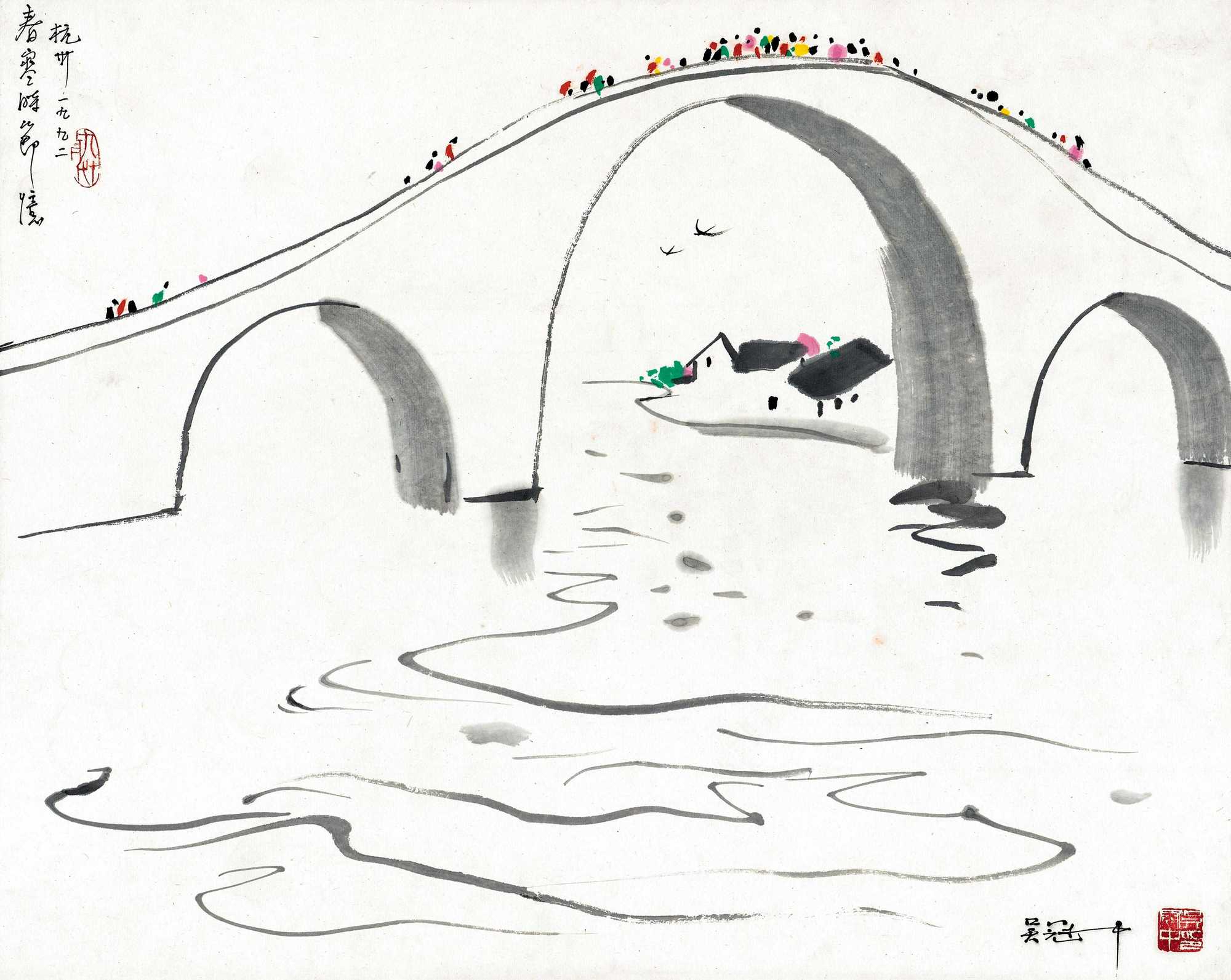 吴冠中珍罕拱宸桥主题之精品《春寒时节忆杭州》以186万港元成交。本作描绘建于明代的杭州知名石桥“拱宸桥”一景,综观艺术家毕生创作,该主题之作仅有四件,当中两件已分别为北京中国美术馆与香港艺术馆收藏,而此作为四者中尺幅最大、年份最早者,可见其珍稀性。