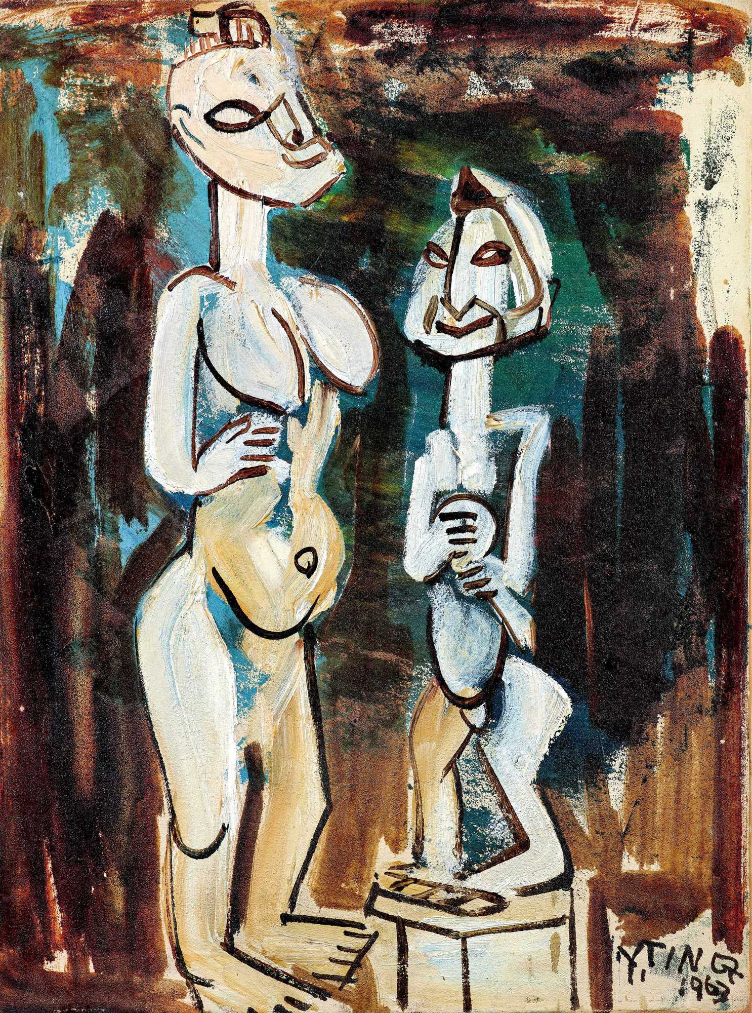 《人体》为丁衍庸毕生仅8件的“原始雕像”主题精品,以156万港元成交。本作所描绘的雕塑曾五度出现在其油画中,推测为其个人收藏的一环。因艺术家对非洲原始部落的木雕、台湾原住民的雕刻具浓厚兴趣,因而在作品中,融合展现出多元文化的综合体。