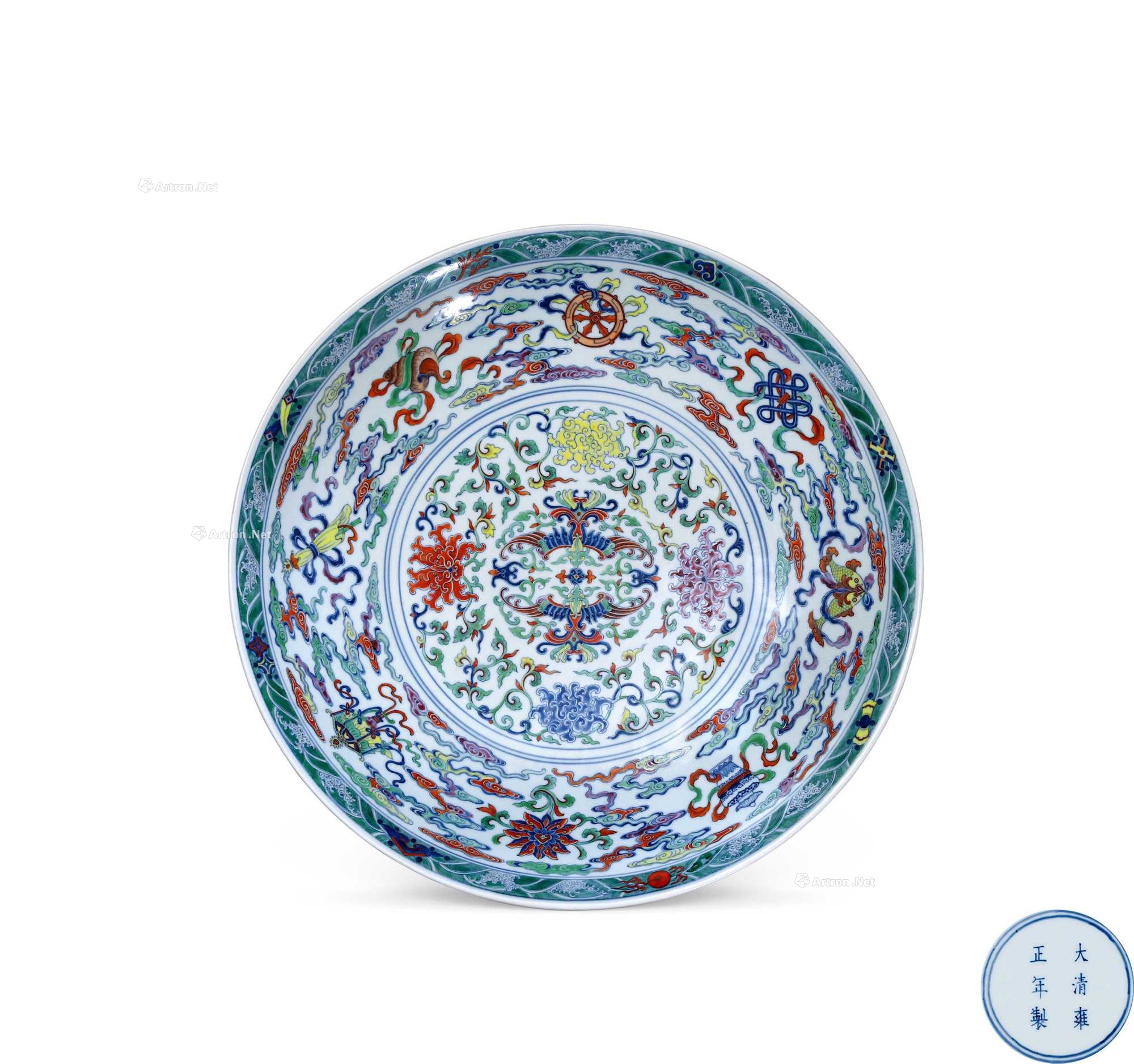 清雍正 斗彩八宝夔凤纹大盘以172.5万元位居专场第三名。八宝纹又称八吉祥纹,为藏传佛教图样,始见于元代。八宝包括轮、螺、伞、盖、花、罐、鱼、肠八种佛教法器,均取意吉利,在明清两代成为宫廷御用瓷器的重要装饰之一。夔凤纹起源于古代青铜器纹饰,承袭商周青铜器祭祀功能,象征君权神授。此品绘八宝、夔凤于一盘,构图疏密有致,繁而不乱,巧妙融合了宗教元素与皇家审美需求。