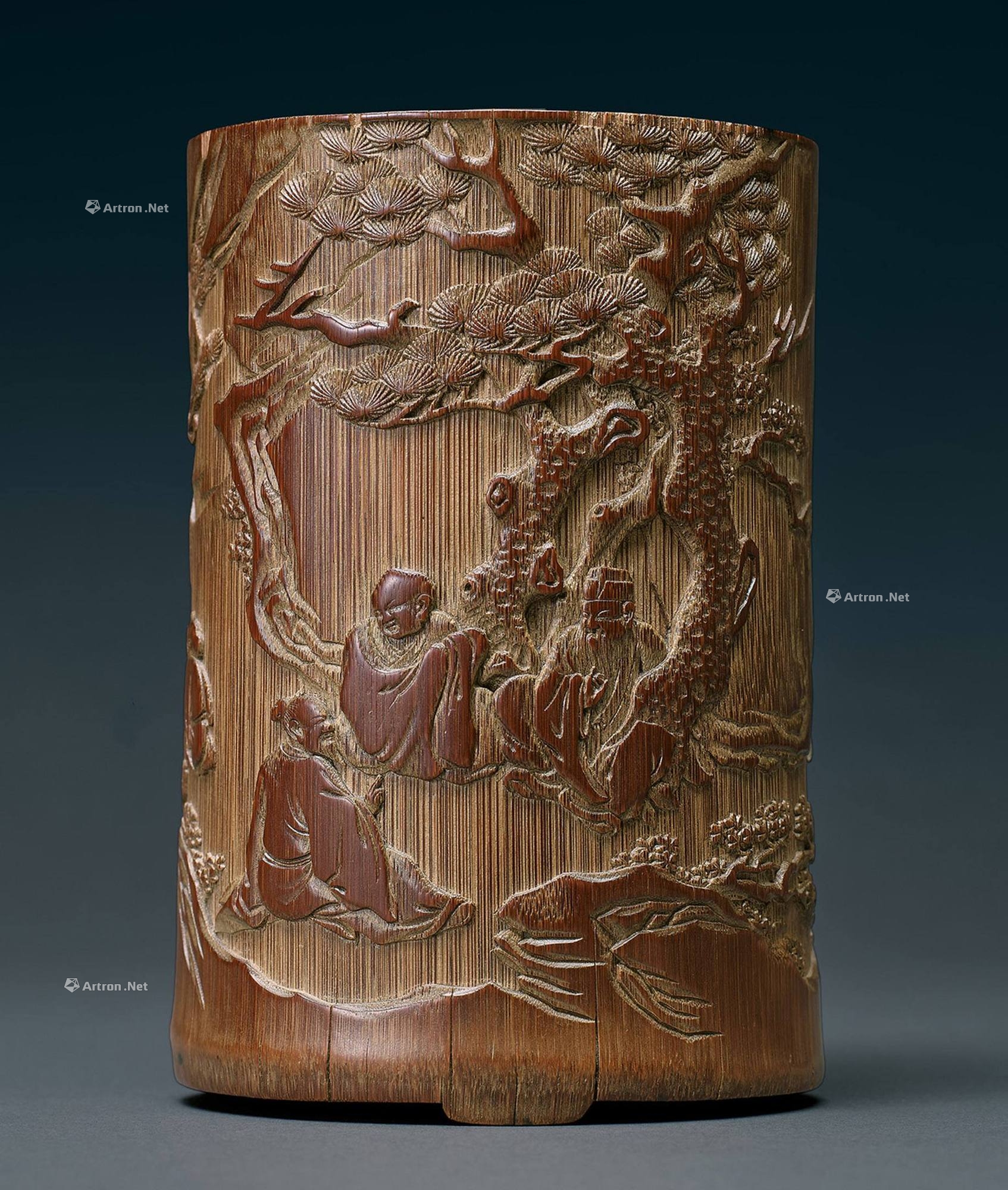 18世纪〈白玉虎丘试茗图笔筒〉,为香港藏家于1997年专程造访台湾所寻得。笔筒形体硕大,器壁通景式雕琢「虎丘品茗」雅趣。画面中山峦叠嶂,树木英华滋润,集高、浅浮雕和线刻等多种技法于一身,繁简相宜,实属难得清代玉器珍品。