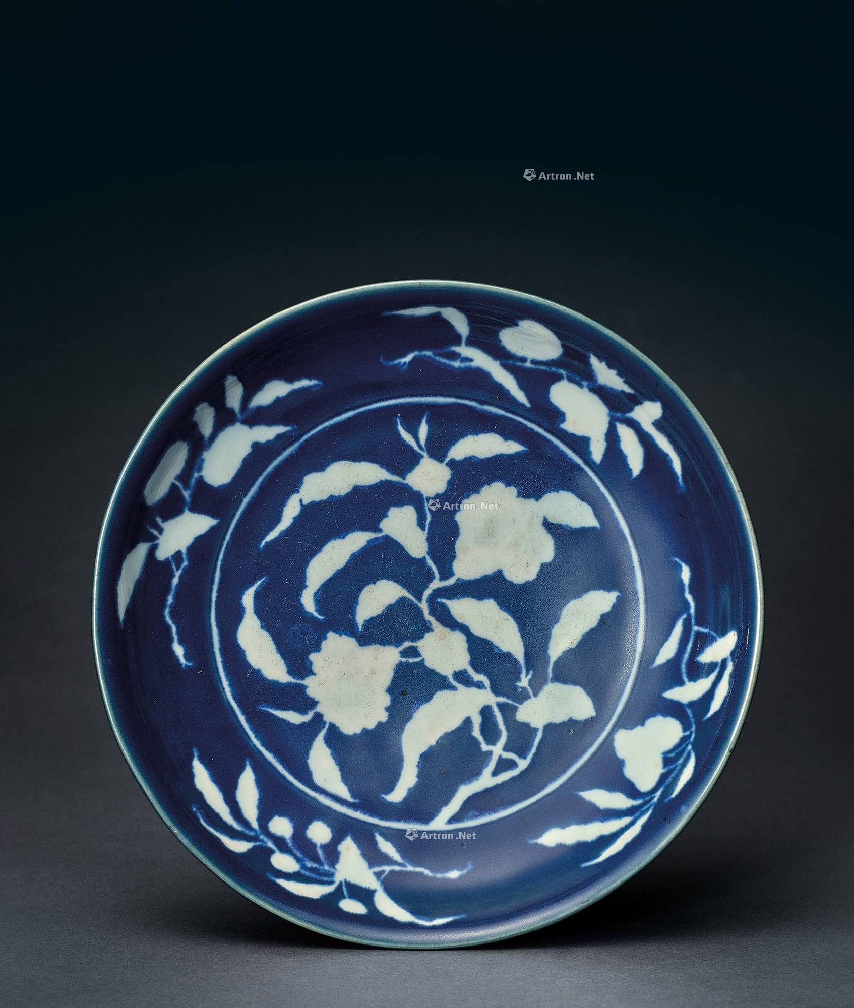 明宣德〈蓝地白花折枝石榴花果纹盘〉,霁蓝釉沉稳深邃,白釉细描暗花,构图清丽,实属罕见重器。此类器物传世寥寥,堪与2024年纽约佳士得之同类品相辉映。