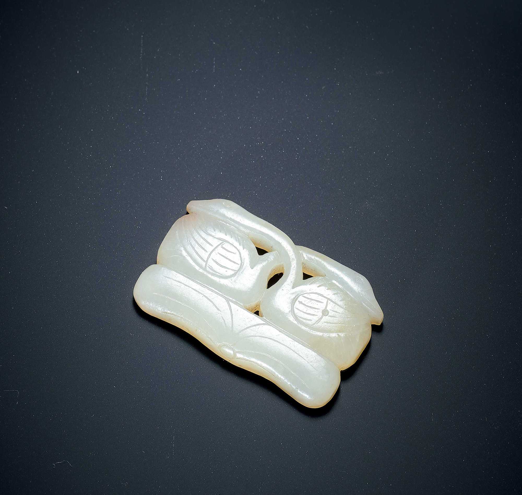 本品为长方形白玉佩,玉质莹润,澄澈通透,色泽匀净洁白。采用镂雕技法雕琢双雁交颈相依之景:双雁体态丰润,颈项缠绵相绕,姿态亲昵温存;双目刻画灵动传神,羽翼以细密阴线分层勾勒,纹理清晰,层次分明,富于韵律,细腻还原雁鸟羽翼的蓬松质感与自然形态。底部衬饰简约荷叶纹,与主体呼应,整体布局紧凑和谐,于方寸间营造出鲜活生动的画面感。