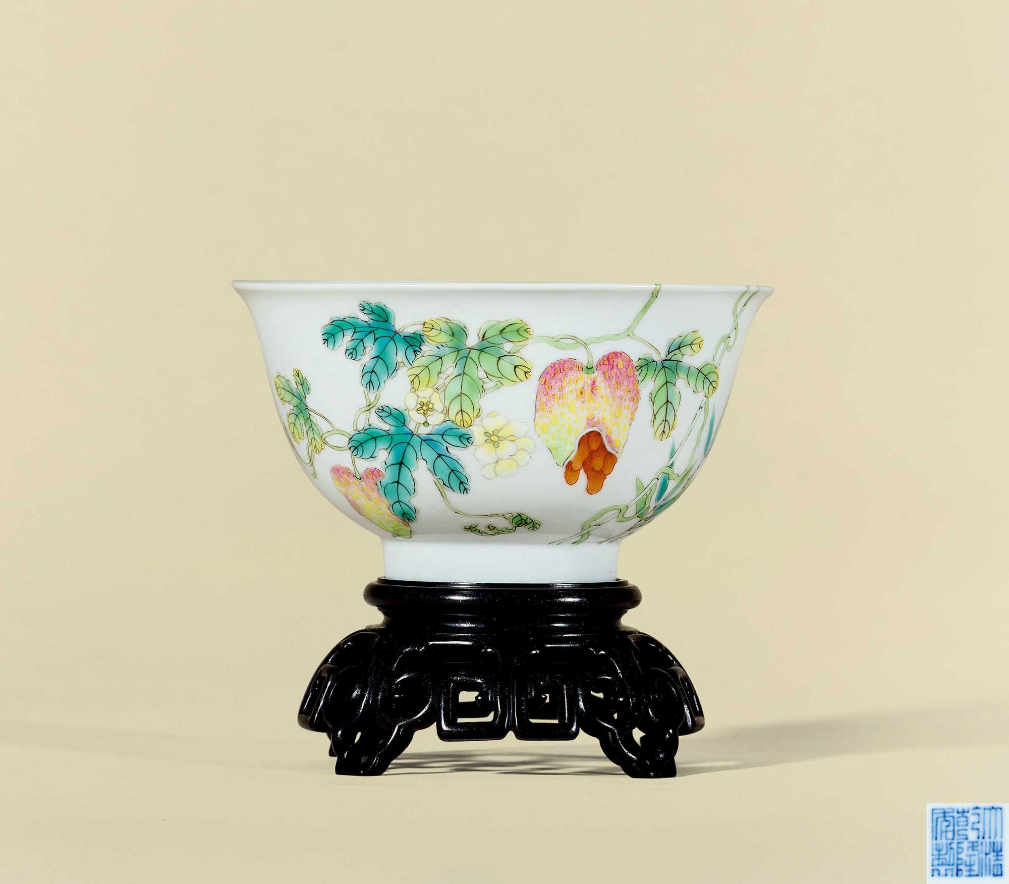 本品为乾隆御用茶具之名品。碗侈口,弧腹,圈足,通体施白釉,胎质莹润细腻,釉色洁白匀净。外壁以粉彩绘过枝癞瓜图,过枝类器物始见于雍正,盛于乾隆,后朝续烧不绝。此类纹饰出自内廷画师奉旨设计画样,交付御窑厂后,由彩绘匠人精心摹绘而成。其胎釉之精、彩料之纯、画工之湛,处处彰显御窑水准,予人完美无瑕之感。整体纹饰取“瓜瓞绵绵”之吉意,寓意福寿绵长、子孙延绵,为传统宫廷御用祝寿佳器。
