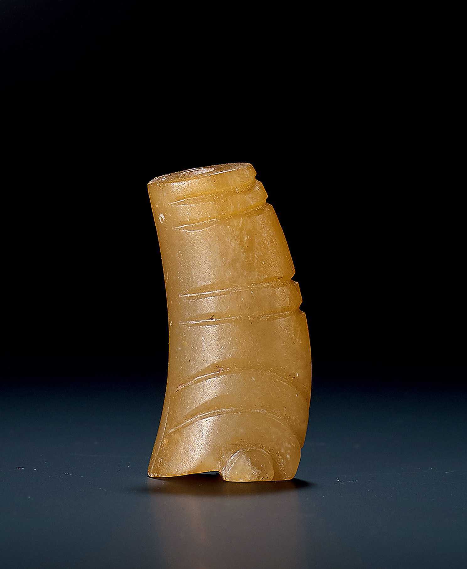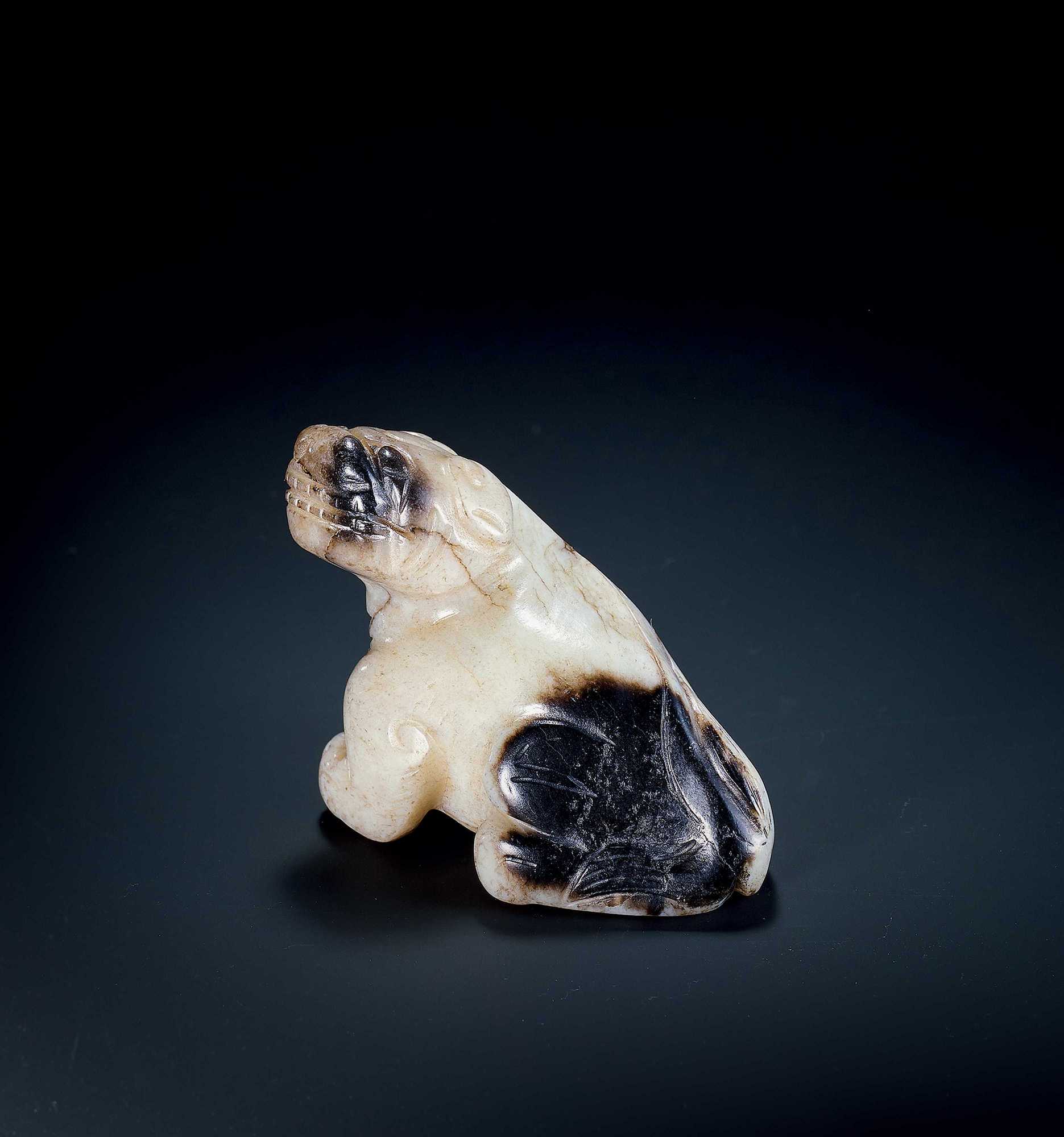 瑞兽以灰白玉为材,局部带沁。采圆雕技法,瑞兽匍匐于地,回首远视,张口露齿,首尾相向,双耳竖起,面部似狮,圆眼大鼻。肌肉饱满,体态健硕,不怒自威。本品雕琢刀法精致细腻,浑圆丰满,极为罕见。