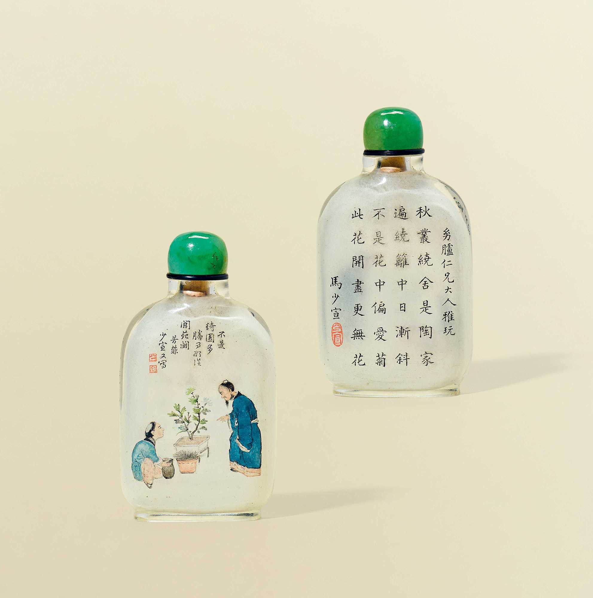 此鼻烟壶作圆角长方壶体,配翠玉壶盖,形制典雅。正面绘“爱菊图”,图中一着长袍的雅士正指点仆僮修剪盆中丛菊,意境清雅。画面上方以楷书题写:“不是绮园多胜事,那从阆苑斗芳菲”,落款“少宣又写”,并钤有“少”“宣”单字篆印。壶背面上款为“幼胪仁兄大人雅玩”,下款“马少宣”,下钤“少宣”单行篆字椭圆印;中间以端庄欧体楷书录唐元稹《菊花》诗:“秋丛绕舍是陶家,遍绕篱边日渐斜。不是花中偏爱菊,此花开尽更无花。”字迹工整,章法严谨,充分展现了马少宣以欧阳询楷书入内画的独特风格。