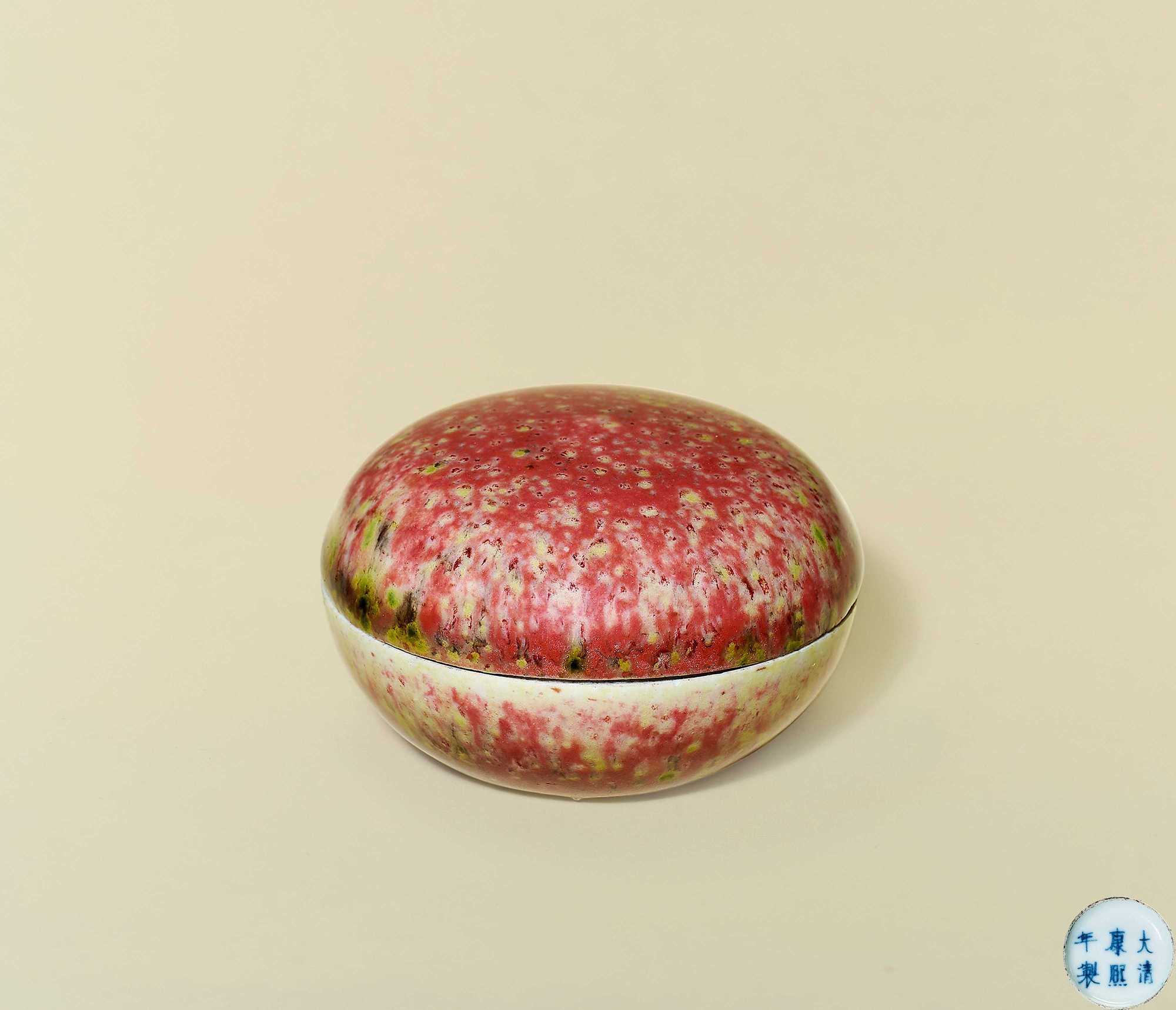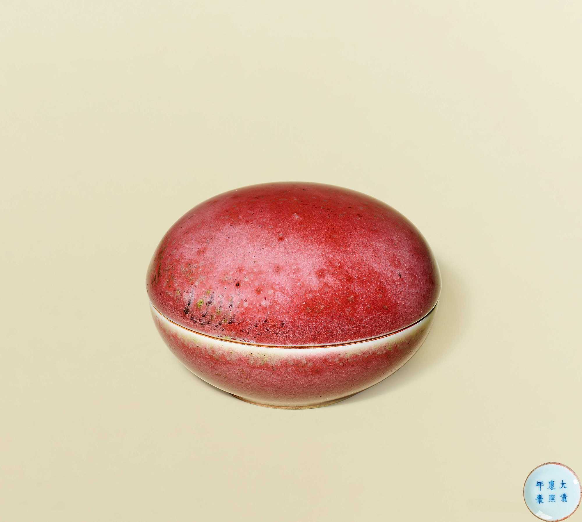 豇豆红釉为清康熙时创烧色釉品类,烧造难度极大,传世小件文房器物居多,以多变的色泽与隽秀的器型而闻名,备受海内外藏家推崇。本品即为民国仿康熙豇豆红经典之作。盒呈扁圆状,子母口,印盒器型饱满,造形小巧玲珑,胎体厚重,釉质莹润自然,桃花红中泛出些许绿苔,淡雅宜人。底施白釉,落“大清康熙年製”六字三行楷书款。