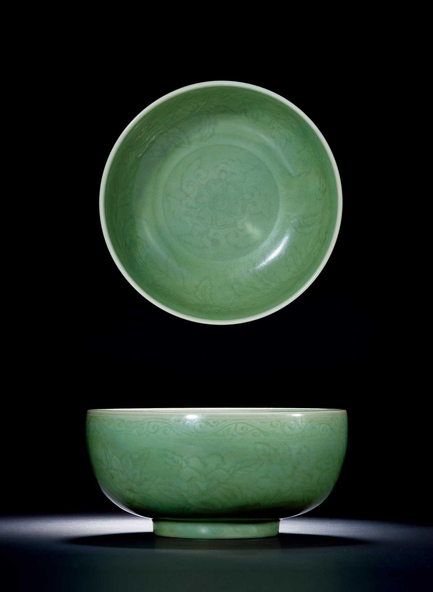 碗造型古朴端庄,通体施龙泉青釉,釉色清透苍翠,温润如玉。器身内外均以剔刻技法装饰,外口沿饰缠枝卷草纹,与常见的灵芝纹不同,别具一格。碗外壁刻划折枝花卉,茶花清雅高洁,牡丹富丽娇艳;内壁则饰缠枝四季花果纹,枝叶舒展繁茂,花果生动鲜活。碗心点缀花卉纹,整体构图饱满,刻工娴熟流畅。圈足裹釉,内留涩圈一周,修坯规整,为垫烧工艺所致。整器品质卓越,气韵严谨,堪称永乐时期龙泉官窑的典范之作。