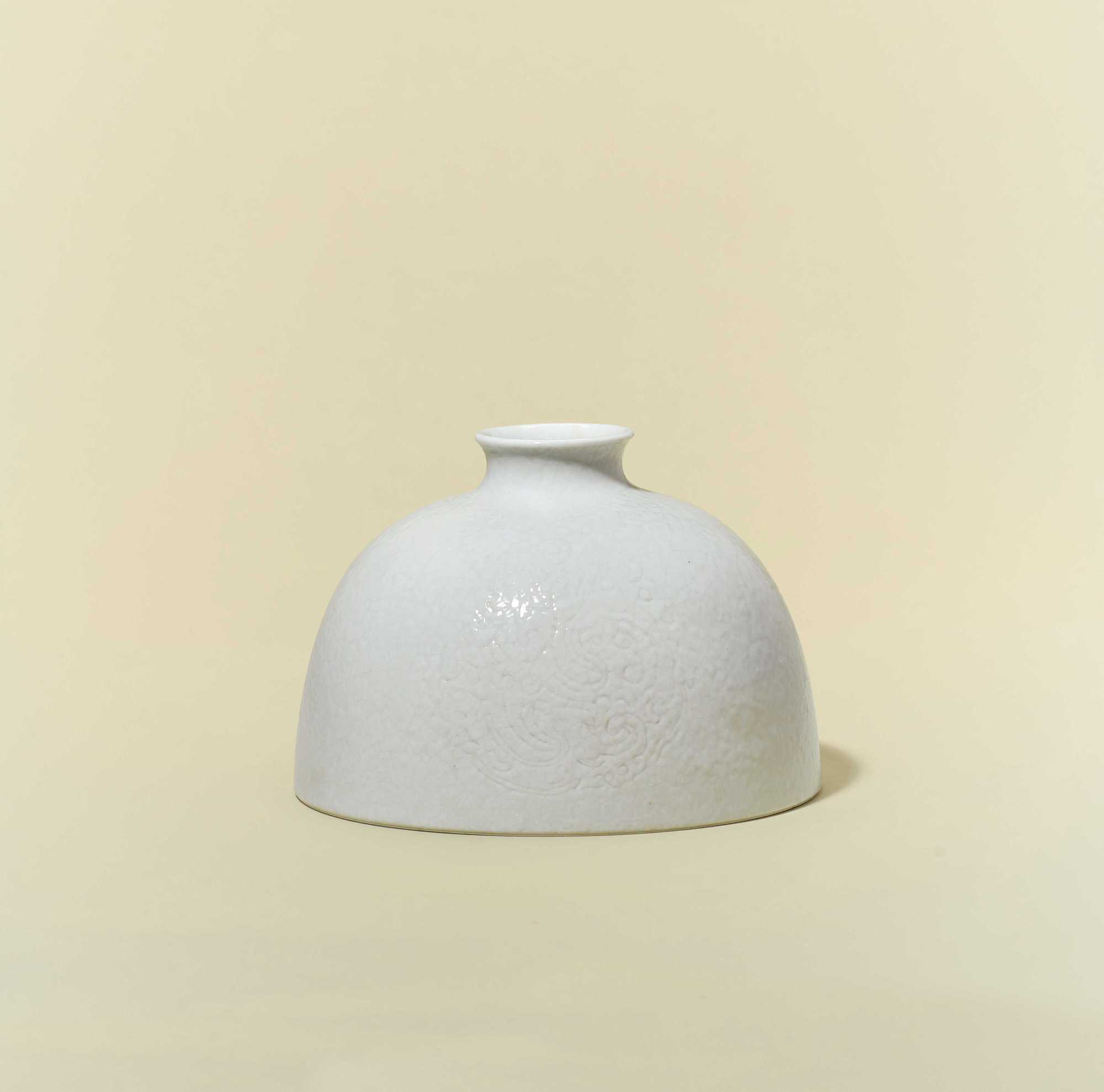 康熙一朝太白尊以豇豆红釉最为常见,白釉者则极为罕有,本品即为一例。其器形精巧隽秀,盈手可握。唇口微侈,线条圆润外翻;短颈过渡自然,肩部丰腴饱满,至底端含蓄内收,配以浅细圈足。胎体为特选浆胎制作,胎质细腻洁白。外壁以暗刻技法装饰三组团螭纹,每一螭龙盘曲成圆形,龙首矫健,身形婉转,鳞甲细微处皆刻画入微。