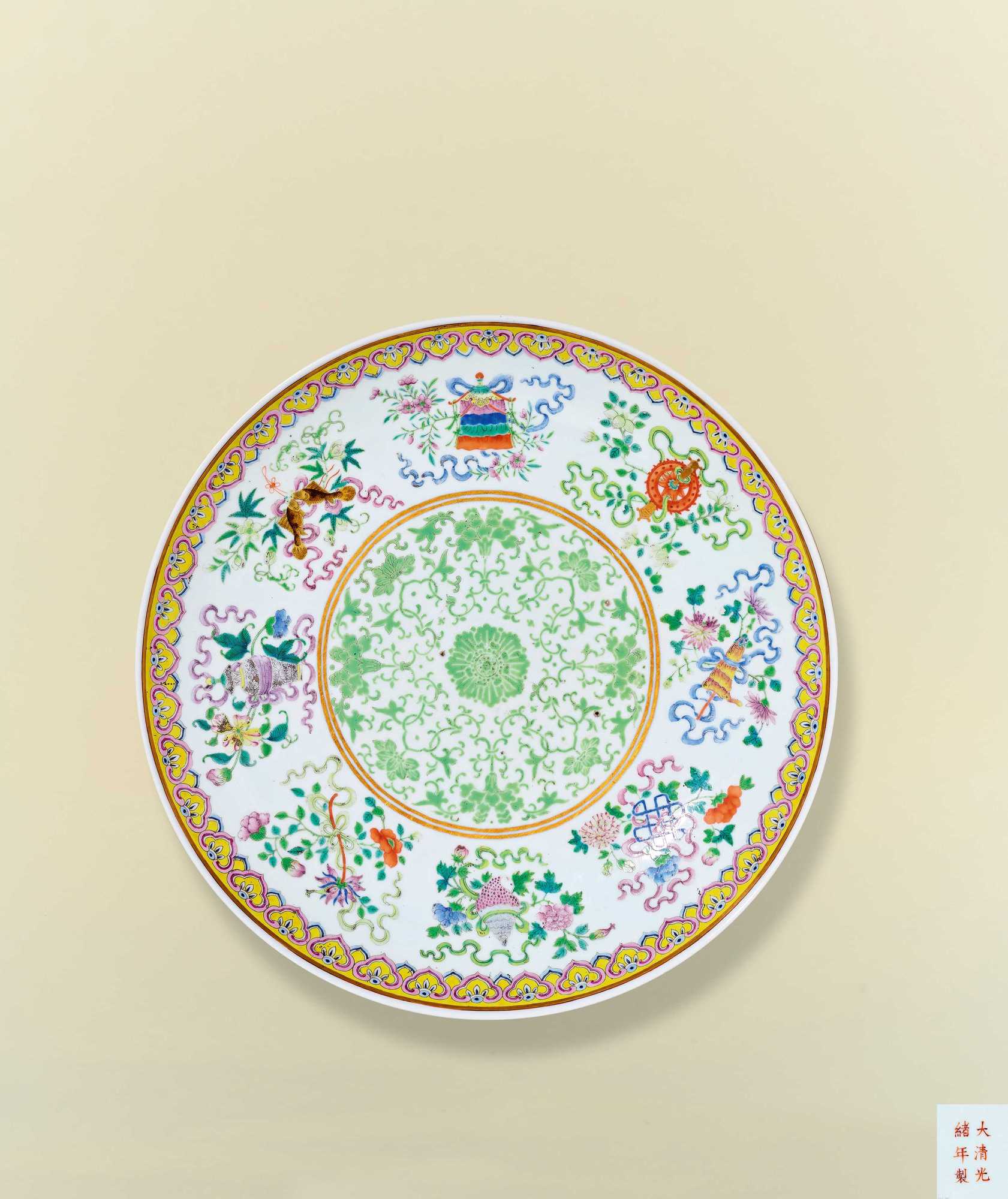 拍品敞口,浅弧壁,造型规整,圈足。盘内口沿处以粉彩绘饰一周如意云头纹,盘心则以绿彩勾勒宝相花纹,典雅庄重。内壁口沿另饰金彩弦纹一道,其外环饰八吉祥纹,分别为轮、螺、伞、盖、花、罐、鱼、长,诸宝绘工细腻,彩料莹润,排列有序,环绕盘心,寓意祥瑞,气象恢宏。外壁饰以三组折枝花卉纹,与盘内纹饰内外呼应,构图饱满,意趣盎然,呈现出一派生机。盘底心以矾红彩书“大清光绪年製”六字双行楷书款,字体工整,笔力劲健,属典型光绪官窑款识。