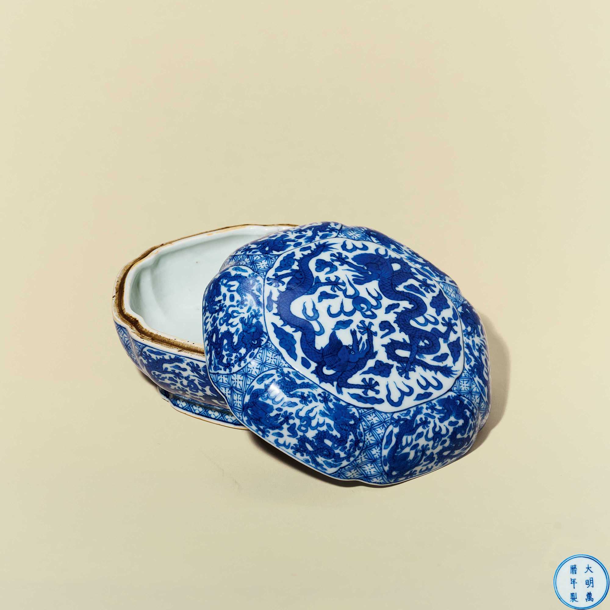 盒呈六方倭角造型,盖与身子母口相合,下承圈足,器形规整,端庄秀雅。胎体厚重坚致,釉层莹润,为明代晚期瓷器的典型特征。通体以青花为饰,盖面主体绘双龙戏珠纹,龙身修长,五爪张开,姿态矫健。盖与盒身六面皆设开光,内亦绘双龙戏珠纹。盒底心青花双圈内书“大明万历年製”六字双行楷书款。