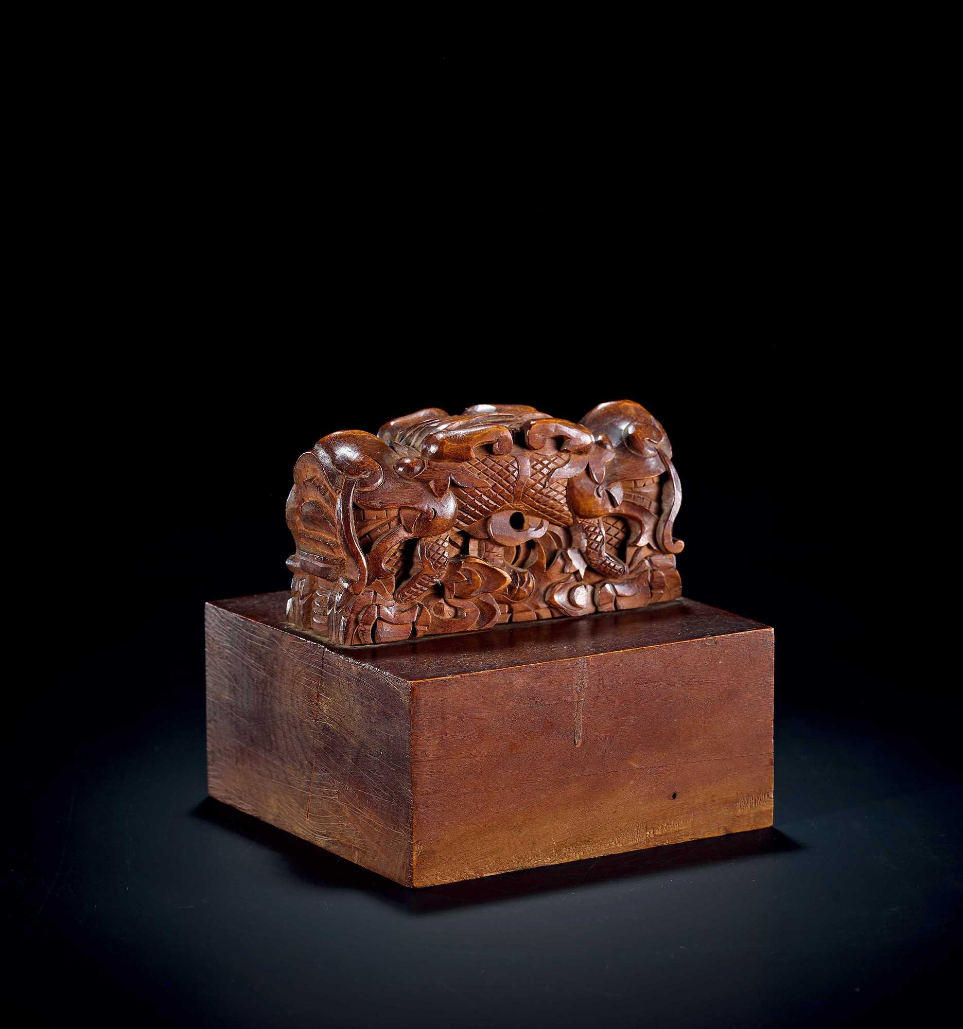本品是清代宫廷印玺艺术的杰出代表。该玺以珍贵檀香木为材,整体造型规整庄重,充分展现清代宫廷工艺的精湛水平。其器形特征主要体现在两个方面:一是印体方正,通体采用上等檀香木整料雕琢而成,选料考究,木质致密;二是印钮设计为双龙交叠的交龙钮造型,龙身鳞片细密,背部穿孔设计便于穿系。这种器形既符合清代宫廷印玺的规制要求,又兼具实用性与艺术性。
