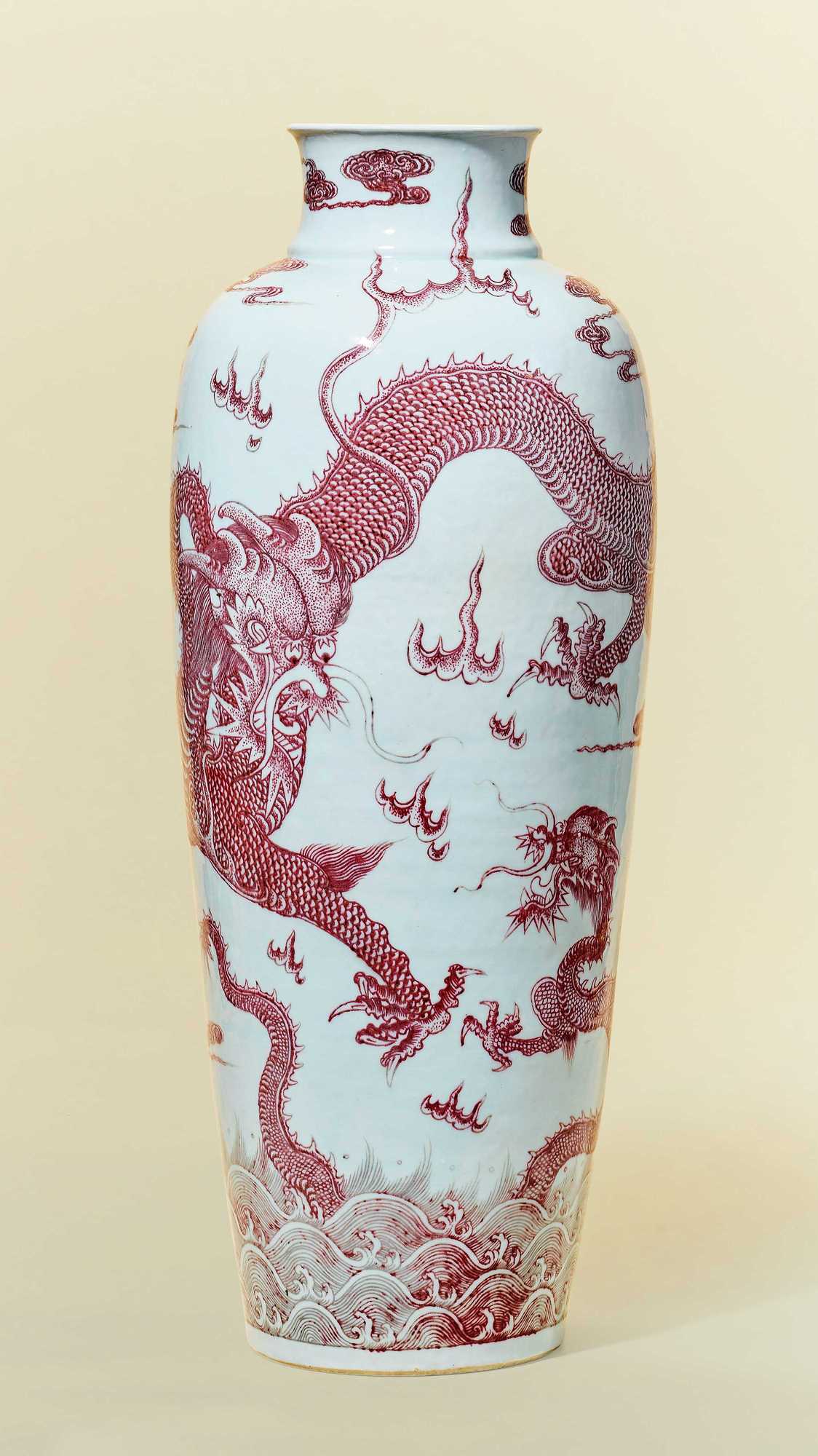 本品撇口束颈,丰肩收腹,下承浅圈足。造型典雅挺拔,胎釉坚致光润,莹白细腻,通体以釉里红装饰,外壁通景绘苍龙教子图,一条苍龙飞腾空中,身姿矫健雄壮,五爪锋利,胫部海浪汹涌,幼龙跃出海水,与苍龙彼此呼应。龙纹描绘精细,釉里红发色纯正。