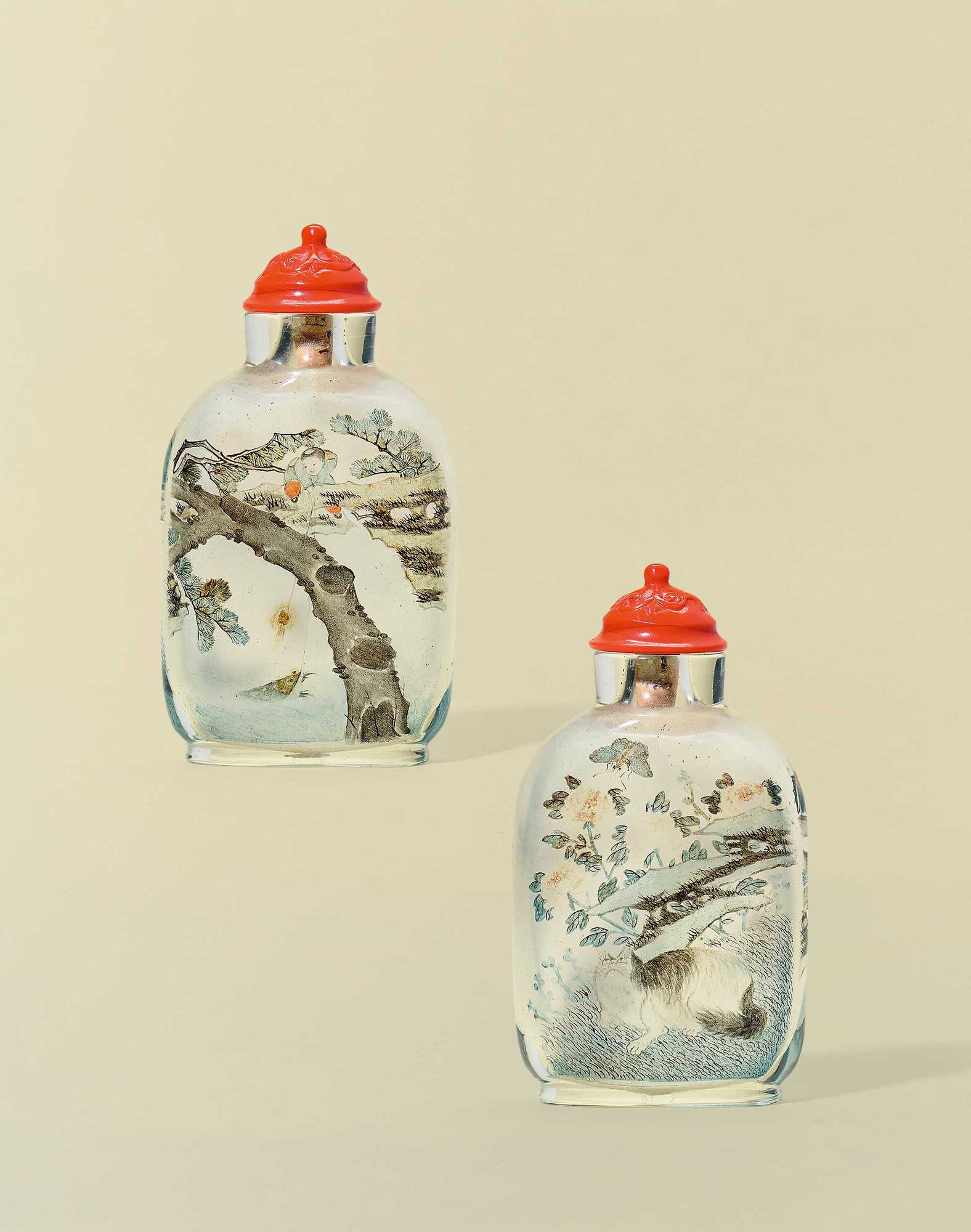 本品器身敦实厚重,以双面内画技法绘就不同景致。虽无款识可考,然其画工精湛、气韵生动,堪称文房雅玩上品。一面绘“稚子钓虾图”:小童跨坐岩上,手持钓竿,线下水中一巨虾正探首欲饵。另一面为“猫蝶嬉戏图”,取“猫蝶”谐音“耄耋”,寓祝寿延年之吉意。通体内画技艺高超,无论稚童的纯真、花猫的灵动,抑或山石肌理、花叶层次,皆刻画入微,笔墨间尽显作者深湛功力与对自然万物的细致体察。双面画意融生活情趣与祥瑞寓意于一体,虽未落款,仍不失为一件兼具赏玩与收藏价值的珍品。