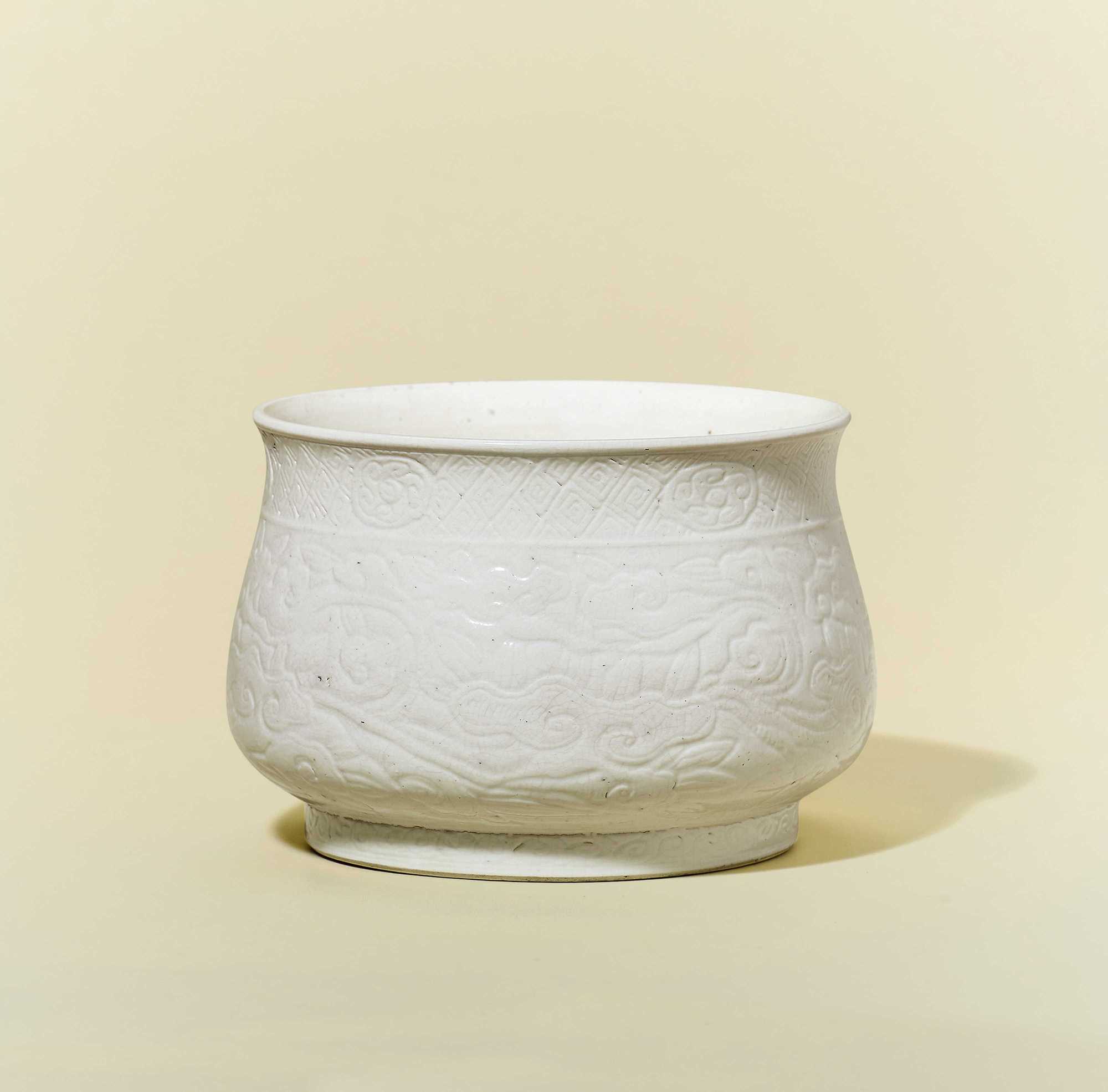 本品施仿定白釉,侈口,垂腹,及底内收,下承圈足。器身外壁暗刻锦地团寿纹一周,腹部满饰灵芝纹。灵芝瑞草刻画生动,线条流畅,布局饱满,繁而不乱,立体感极强,寓意祥瑞,为案头焚香佳器。