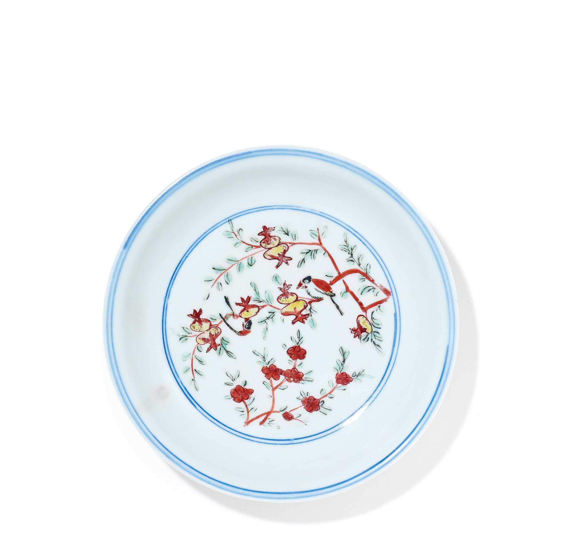 盘作敞口,弧壁舒展,平底圈足。胎质细腻,釉色莹白温润。口沿内外及盘心均饰青花双弦纹,内壁以五彩绘就花鸟主题:盘心一株石榴枝繁叶茂,果实累累,两只灵鸟栖于枝头,目光炯炯,神采奕奕。花枝自下方蔓延而出,红花绽蕊,娇艳欲滴。构图布局疏朗有致,笔意古拙浑厚。外壁以青花绘灵芝螭龙纹,笔触流畅,气韵飞动,青花发色明艳湛然。底心青花书“大明万历年製”六字楷书款,笔力遒劲,布局工整。