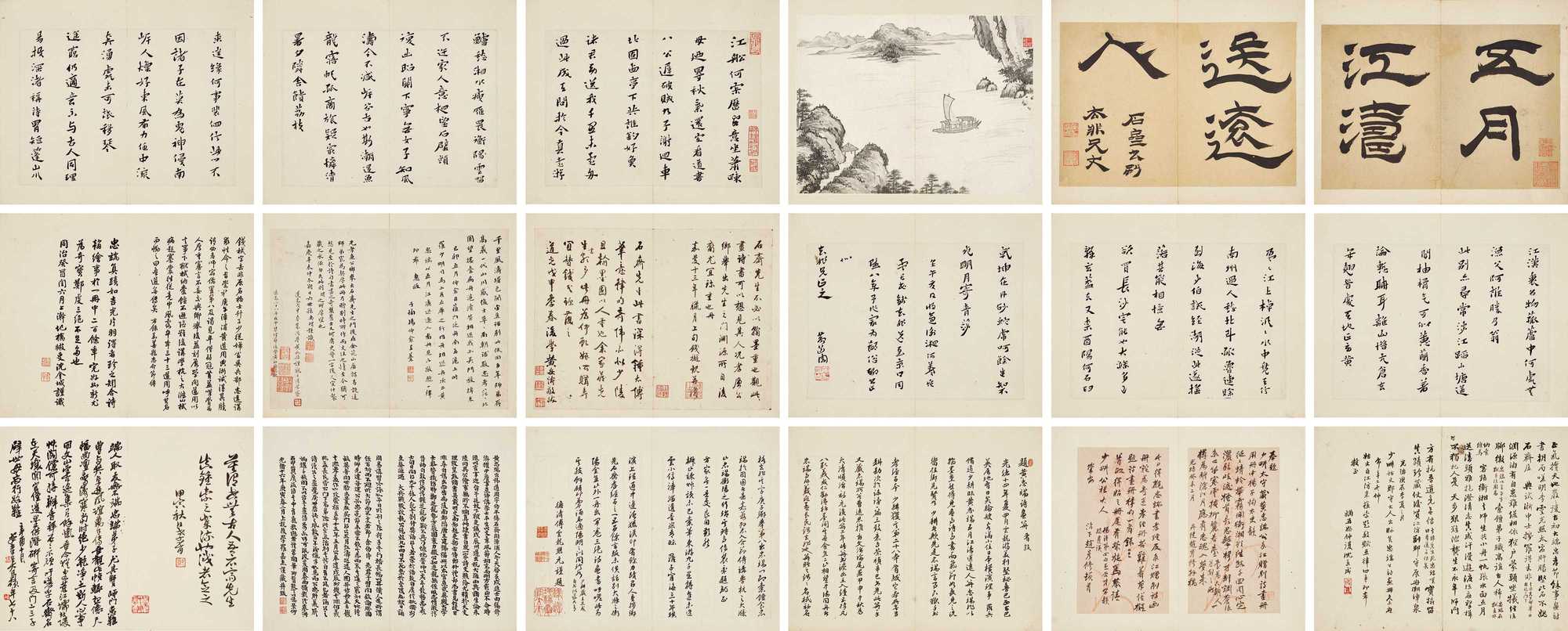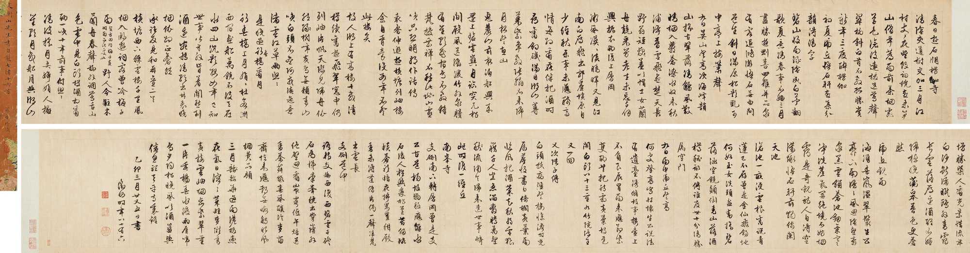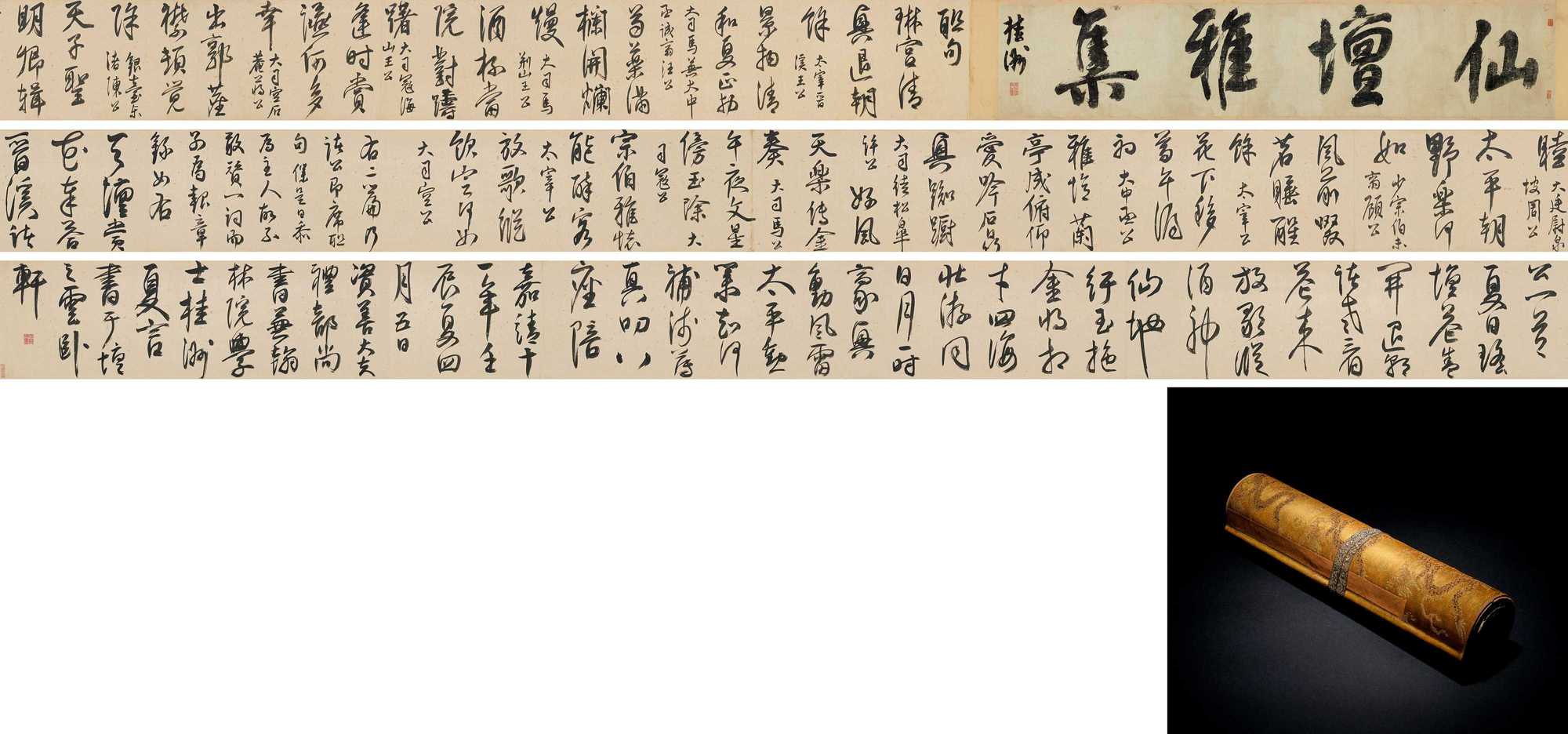 此《行书仙坛雅集诗》卷是嘉靖十一年(1532)四月初五日,时任礼部尚书的夏言于早朝后邀约同僚至郊外天坛附近赏花,获邀一同前往者,有其余五部尚书及身居要职的肱骨之臣。众人赏花赏景之余,又纷纷联句吟咏,盛赞君臣和睦,太平盛世。夏言将这些联句诗书写成卷,并和一首,遂成此长逾十一米巨制《行书仙坛雅集诗》卷,并自书引首“仙坛雅集”。这一次“六部尚书齐聚”的雅集,若以身份之尊贵而言,可称“文人雅集第一”,呈现嘉靖中兴的历史面貌,集历史、文学、艺术价值于一卷,识者宝之。
