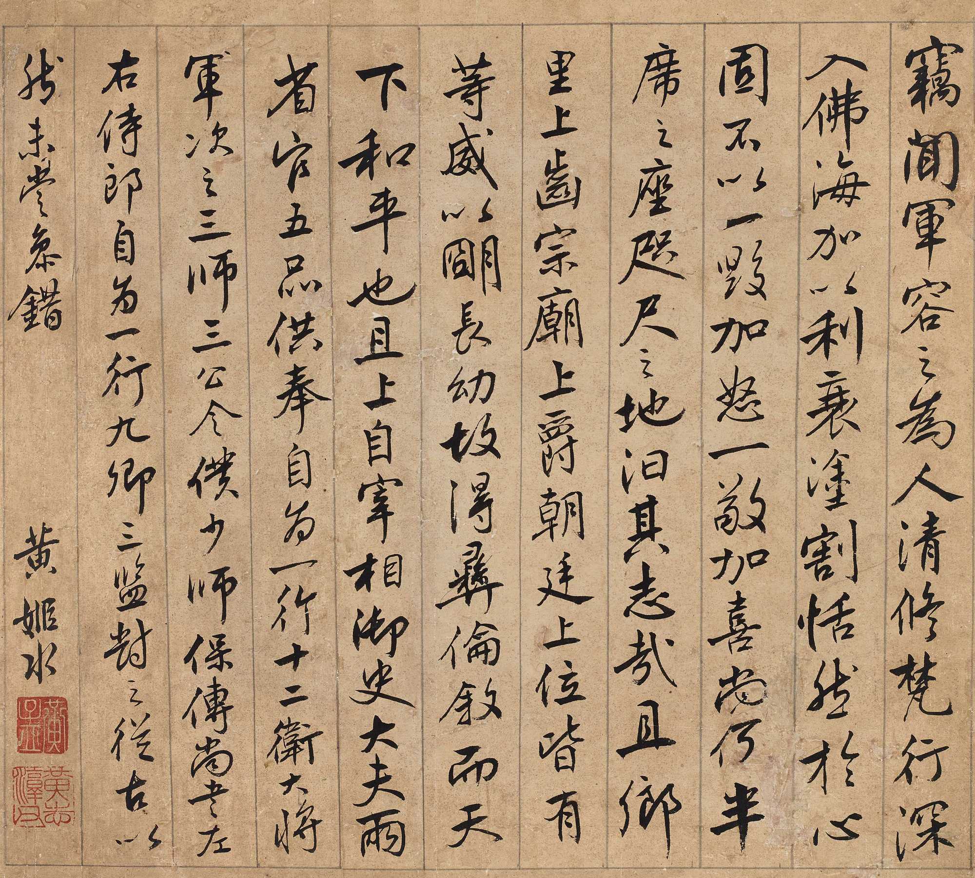 黄道周作为晚明政治史上的忠烈之臣与书法革新家,其书画作品历来为收藏界所重视。究其缘由,一为书法独开生面,风骨嶙峋,艺术成就卓著;二因自谓书画乃“第七八乘事”,故传世作品稀少;更因其学问气节冠绝一时,《明史》称其“文章风节高天下”。《五月江涛送远人》册系黄道周赠与门生钱去非之作,既是对离情的寄托,更暗含对时局的忧思。诗中“人愁北斗孤”等句,折射出晚明士人的集体焦虑。本册不仅集中展现了黄道周高超的艺术造诣,更为研究其生平交游提供了珍贵史料。