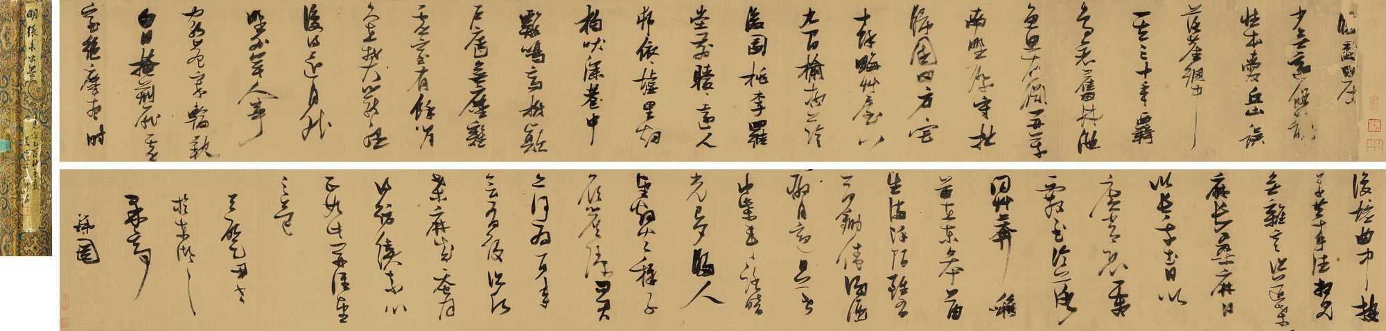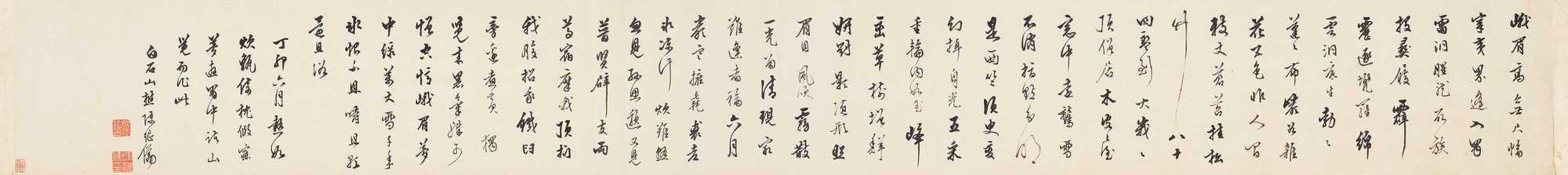 董其昌老友,“松江画派”陈继儒同样为晚明文人书风的代表之一,其书法清逸雅致,融汇苏、米之风而自出机杼,尤擅行草,笔意疏宕,气韵流畅,体现出淡泊自守的隐逸情怀。作品常于不经意间流露出文人的闲适与超脱,其书风影响一时,成为吴门之后江南文人书法的重要延续。张公权旧藏《行书〈峨眉行〉》手卷,写梦游蜀中诗,醒来纵笔记之,故神光落离,跃然纸面,扑人眉宇。