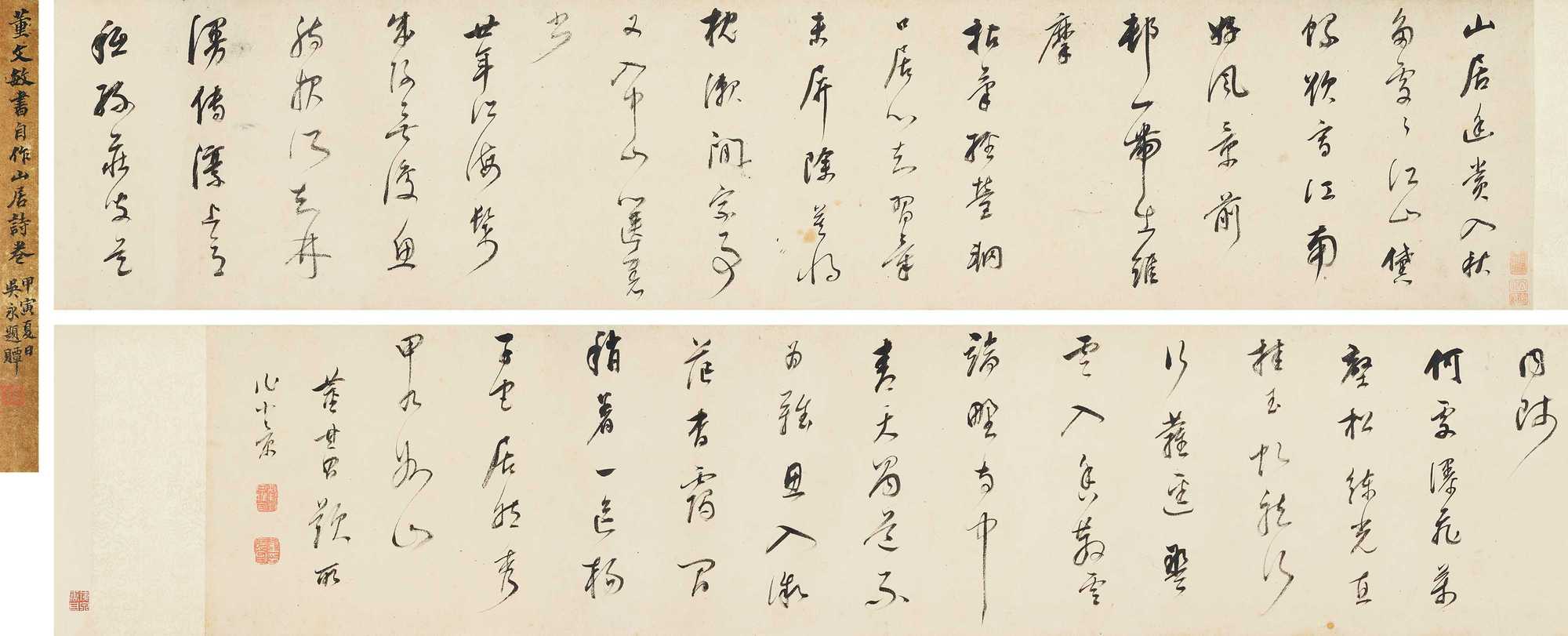 此外本季拍卖,得到北美藏家支持,释出五卷董其昌书法,行草兼备,丝笺并具,蔚为大观。藏家宝存精心,展卷之时,仿若与思翁晤对,见其挥豪在前。除“大观·古代”中的三卷外(编号3199—3201),另两卷在“中国古代书画”专场中呈现(编号3737—3738)。