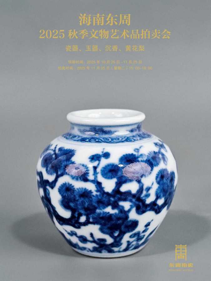 2025年10月25日至11月25日,海南东周2025秋季文物艺术品拍卖会预展在海南三亚保利国际广场1803室进行,11月25日下午15:00正式举槌。本次秋拍以推出精品为原则,将呈现瓷器、玉器、沉香、黄花梨四大类共214套精美拍品,其中瓷器类64套、玉器类74套、沉香类39套、黄花梨类37套。海南东周拍卖力求把最佳的艺术品集中呈现给诸位藏家及艺术爱好者,欢迎诸位藏友莅临现场参观品鉴和竞拍,领略本次秋拍精品的艺术盛宴!
