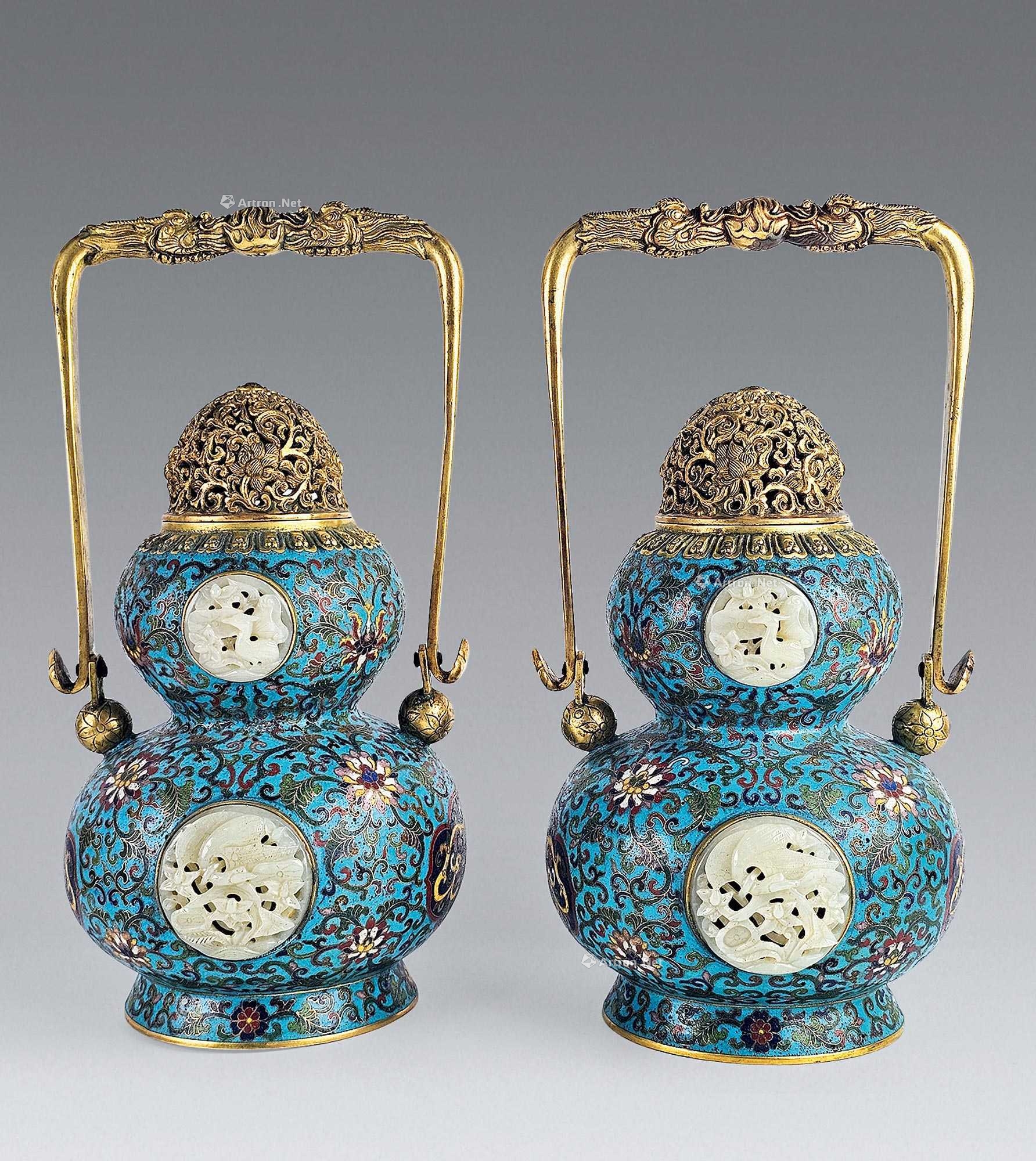 景泰蓝工艺发展到清代,由于得到清廷赏识,由清宫造办处专制供宫廷御用,尤其到乾隆时期其工艺水平达到顶峰。此对乾隆时期景泰蓝鎏金嵌玉葫芦香薰,寓意“金玉满堂”,葫芦之形又寓意“福禄”。其掐丝工艺精湛,珐琅色彩斑斓,鎏金保存完好,是一对不可多得的收藏佳品。