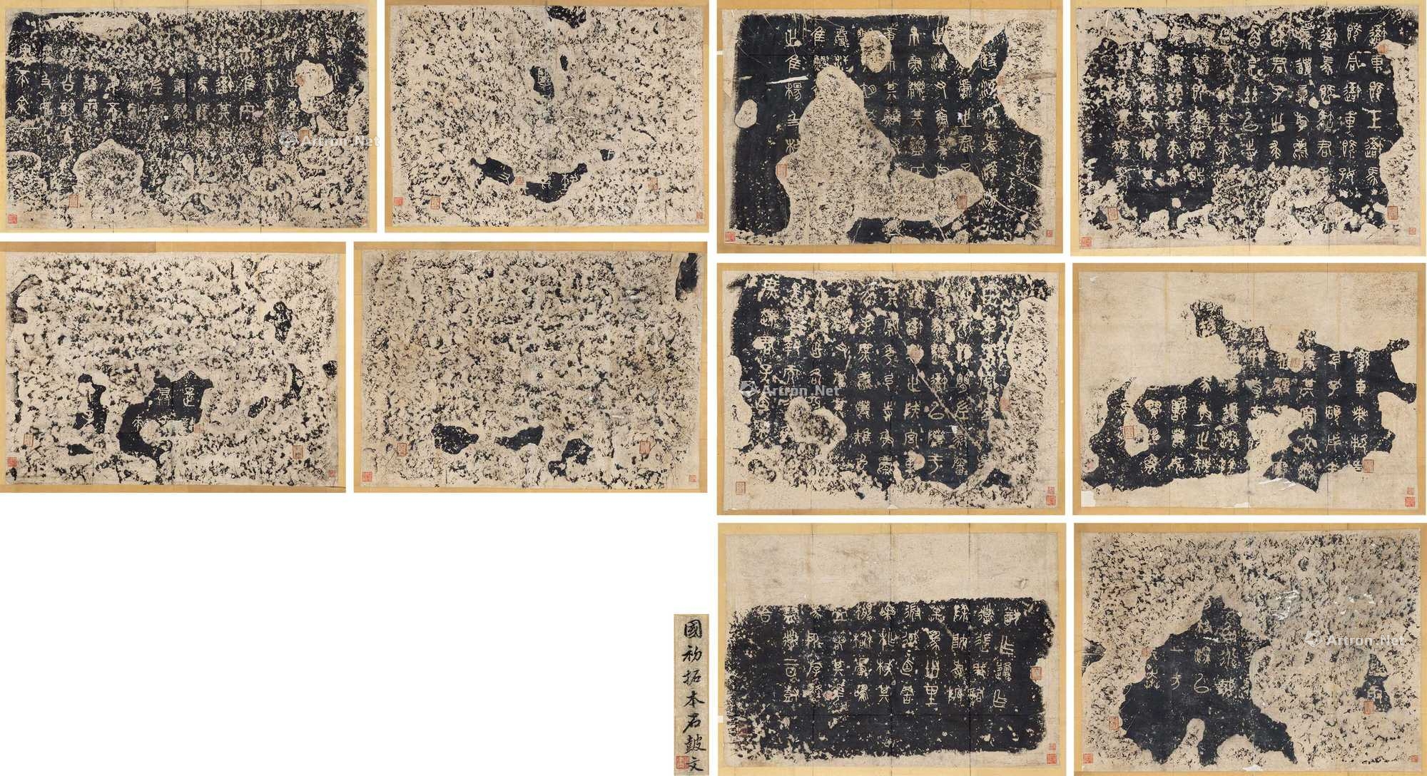 是碑为我国现存最早的刻石文字,共十件,每一石刻四言诗一篇,内容为颂咏君王田狩渔猎之事,故又称“猎碣”。石鼓现存北京故宫博物院。书体在古文与小篆之间,对清代书坛影响深远,杨沂孙、吴昌硕等均得力于石鼓文。此本第一鼓第一行“吾马”未与石花相连,第四鼓末行“允”字石花未贯通。此本即为著名的“吾马”本。十纸齐全,首有吴建钢题“国初拓本石鼓文”。