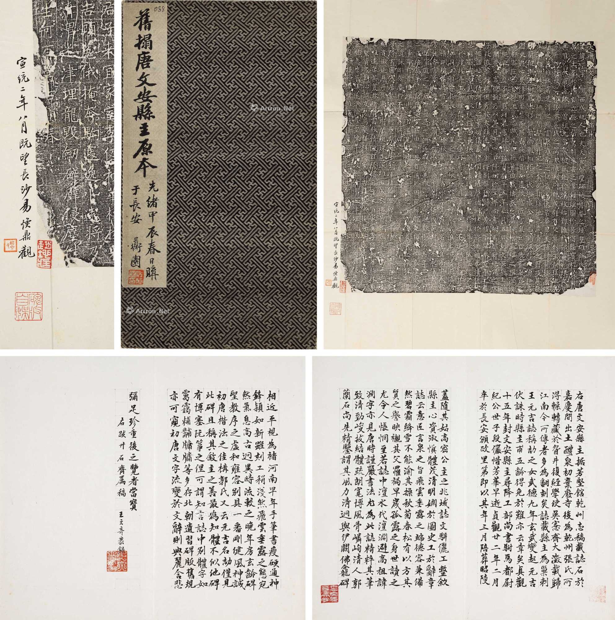 是志全名《大唐故文安县主墓志铭》,刻于唐贞观二十二年(648)。书法在欧褚之间,法度谨严,用笔流畅。志石于清嘉庆年间出土于陕西礼泉,先归县人张光绪,后归吴县吴大澂,再至吴湖帆,1940年代遭兵乱佚失。此本首行“文安县主”之“文”字不损,末行“成日”之“日”字完好,当为初拓。此册封面有清光绪三十年(1904)墨笔题签:“旧拓唐文安县主原本,光绪甲辰春日购于长安,道园”。整拓左下角有宣统二年易焕鼎观款。