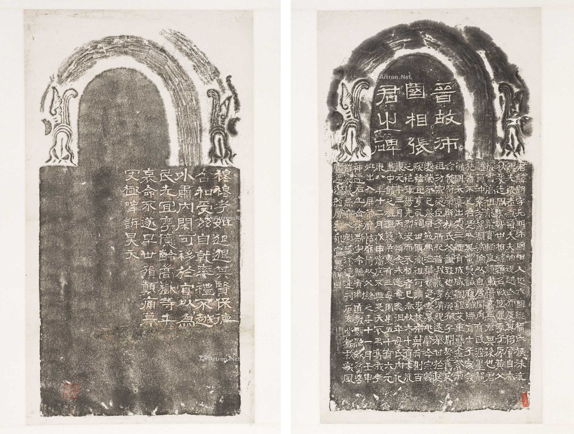 是碑又称《张朗墓志》,晋永康元年(300)刻,隶书,凡25行,行19字。1916年于洛阳后营林出土,隧归日本太仓集古馆,1924年地震碎裂后文字大半残缺。张彦生在《善本碑帖录》中言此碑有“原石拓本很少,见二翻刻本,一精乱真;一恶劣,一望便知为仿刻拓本”等语。可知此碑原刻存世极少,翻刻本亦不常有。此本碑额“晋”字,首横距离碑额边框较远。“沛”字右侧有明显石钉。12行“先烈”之“烈”字“歹”部完好。碑阴无额题。与诸多参考书相校对,系原本无疑。墨色淡雅,品相较佳。极少现身拍场,金石家当为珍视。