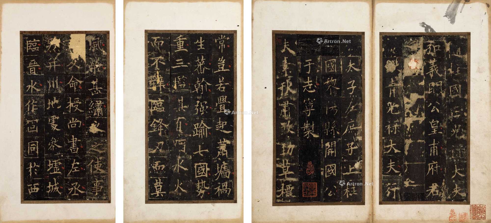 此本为清代名家廉泉旧藏之物,八纸装为四册校对无缺字。经与所见故宫藏朱翼庵本(《欧斋墨缘》著录本,简称“朱翼庵本”)对比,第2行“开国公颜真卿”之“公”左撇尚未泐连石花,而“朱翼庵本”已连,“颜”字“页”部第二横笔此本未连,“朱翼庵本”已连。此种明显早于“朱翼庵本”之差异尚有数十处之多,且有数处多拓残字留存。又以日本宇野雪村本(西泠印社出版)、嘉德拍卖释出之拍场所见最旧拓本等顶尖版本比勘,此本与“朱翼庵本”2本明显胜出其它版本,此本又早于“朱翼庵本”,足可见此本之难得。