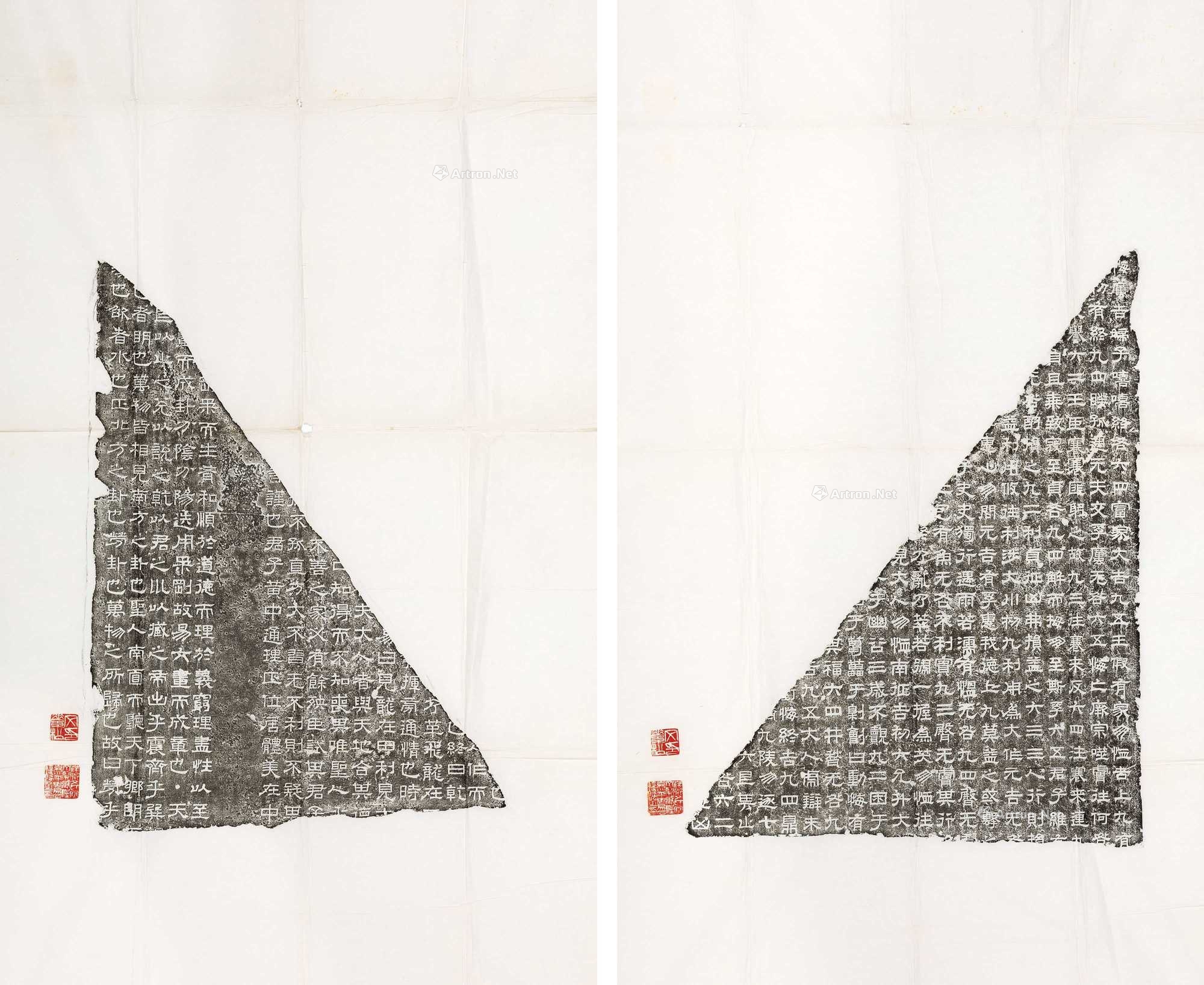 此本为《熹平石经》稀见品种,碑帖界称为“大三角”。自汉以后,儒家学说在文化思想领域内占统治地位,书籍多靠手抄流传,错误在所难免。故东汉灵帝熹平四年(25),由当时的文史学家、兼善尤为精工的著名书法家(相传蔡邕所书),把《周易》、《书经》、《诗经》、《礼记》、《仪礼》、《春秋公羊传》、《论语》等经书手书上石,刻石共四十六块,立于洛阳太学,供读者传抄校对,世称“熹平石经”。此石保存了我国最早的官刻《周易》等文字的原始模样,可做后世校正五经之用。石经东汉末年遭受破坏,现在国内仅藏有残石。此为其中存世最大的一块《周易》残石,传世极少。张彦生《善本碑帖录》记载此本初拓本样貌称“此周易石经大块残石初出土拓本,石未分开,多淡拓,下段石归于右任,拓本日乾面十行日字中稍损泐,上下二石合拓本日字完好”。此石初出土上下先后出土,一分为二,上石归文素松(后归上海博物馆)、下石归鸳鸯七志斋(后归西安碑林)。此拍品为上段文素松初拓本,淡墨,“日乾”之日字未损,钤盖萍乡文氏寅斋宝藏汉熹平周易石经残碑之印、文素松印2枚印信,知其为初拓无疑。此石传拓稀少,此本为文素松初拓绵连纸精拓,文素松仅拓100份,极为难得。与本场拍卖会鸳鸯七志斋初拓本《熹平石经·周易》残石,破镜重圆,实为难得。