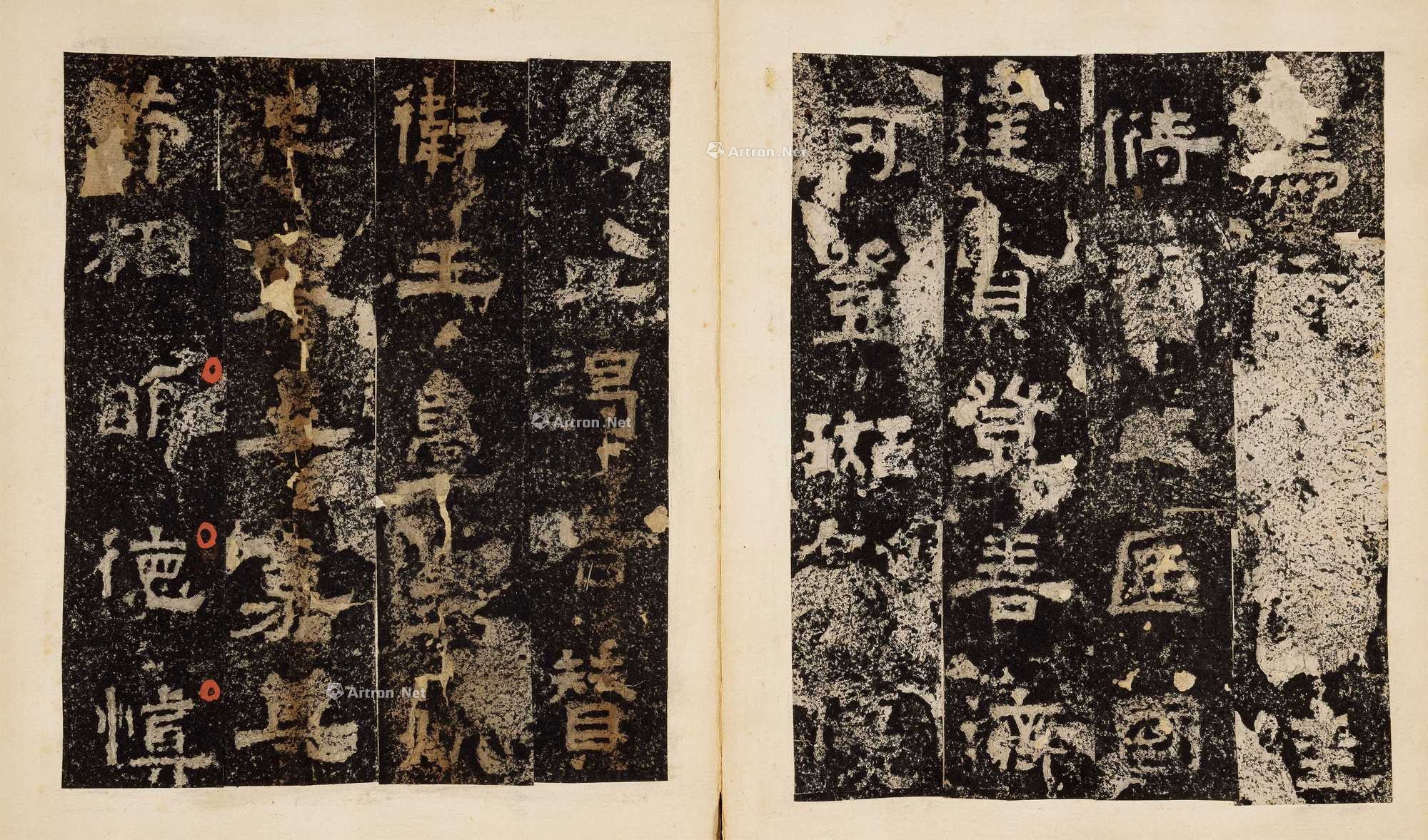 3.递藏情况:此本最早为明代著名收藏家朱仲宗收藏并钤珍藏印一枚、入清后归毛凤枝、晚清归罗振玉并著录于其《雪堂金石文字簿录》中,此本与其著录状态完全一致。民国归著名藏家邵锐所获、册前有邵锐题签,册后又有邵锐题跋3篇。天发神谶碑作为三国东吴传世为数不多的刻石之一,自嘉庆十年石毁后,拓本价格日增。据张廷济《清仪阁笔记》载:嘉庆十三年(1808)南京碑刻店尚有三段碑,索价已十金,嘉庆十四年(1809)到金陵访之肆中,虽悬十金不可得。上海图书馆藏乾隆拓本册中所载光绪末年售价已高达一百四十两。(见仲威先生《碑帖鉴定要解》)
