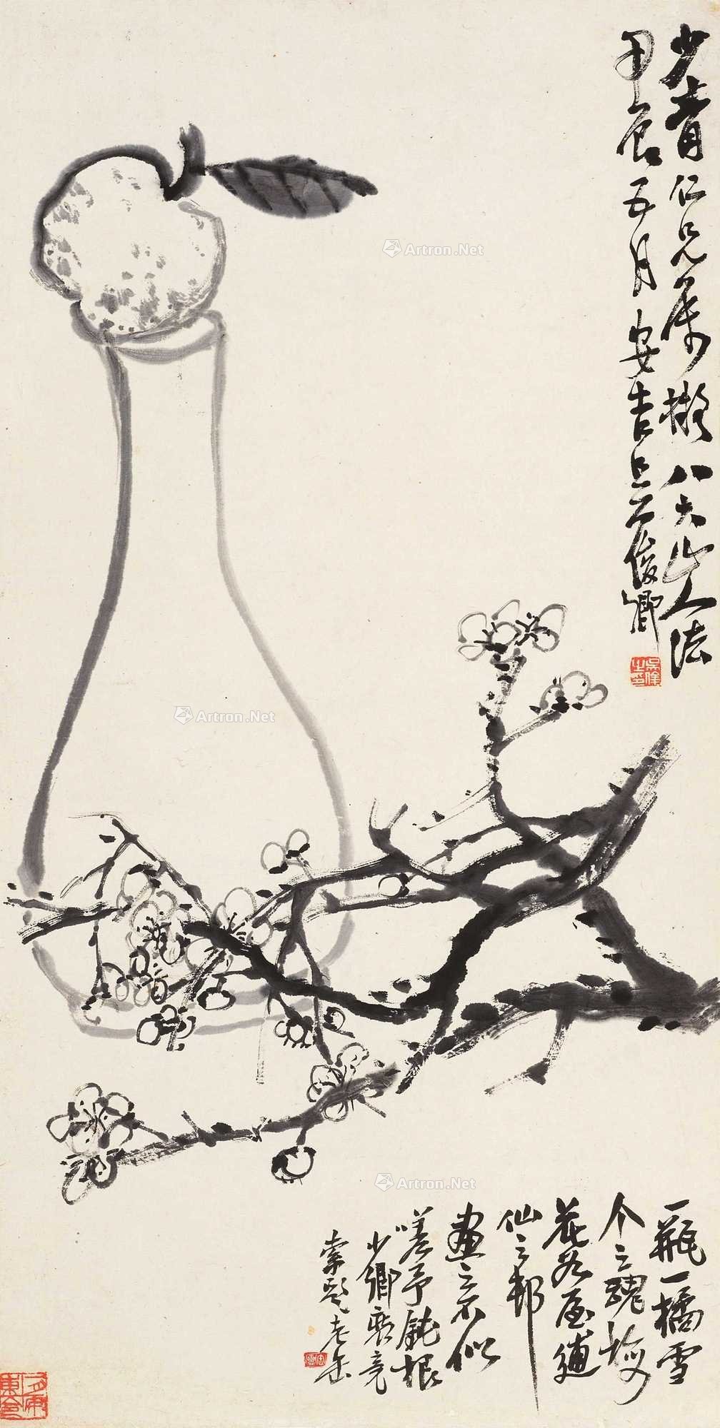 钤印:吴俊之印2.一瓶一橘,雪个之魂。梅花各屋,逋仙之邨。画之不似,嗟予钝根。少卿裴竞索题,老缶。