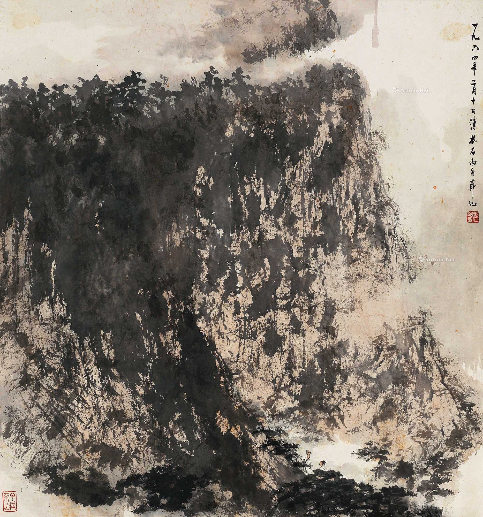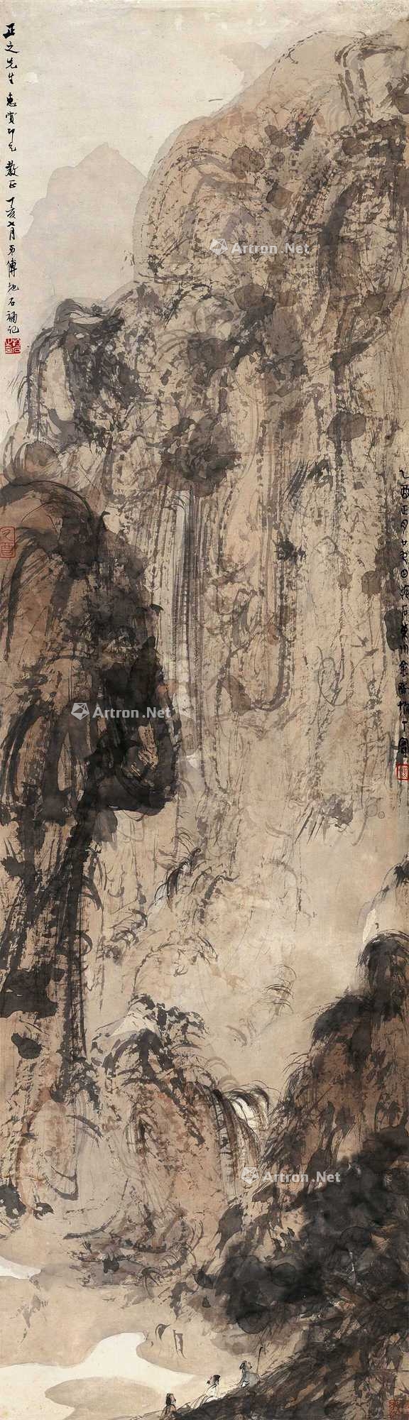 入蜀八年,是傅抱石画风大变的时代。这一时期傅氏山 水画变化丰富,各有特定情境,作法亦随机应变,沉郁 苍茫、淋漓空灵,均能各趋其致。《秋山登临》即是创作于入蜀第七年,为成熟期时作品。是图大片水分作底, 再加以赭色冲晕,转瞬浑化一片,氤氲满纸;复以墨笔 增补,猛刷激扫,似山又似瀑布,云雾蒸腾;东勾西皴, 使之具体;侯稍干,山脚下绘高士一行三人,为首者策 杖,似于混沌中登临,收拾细部,即告完成。