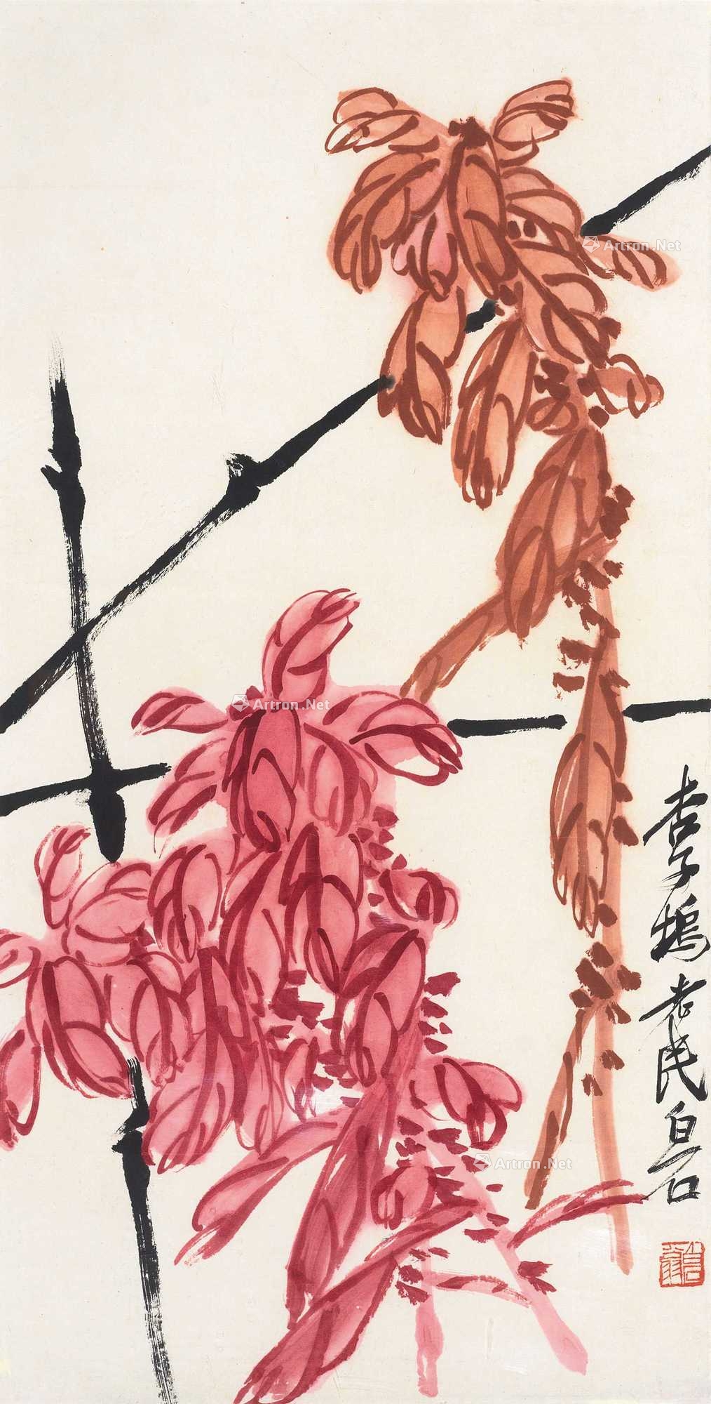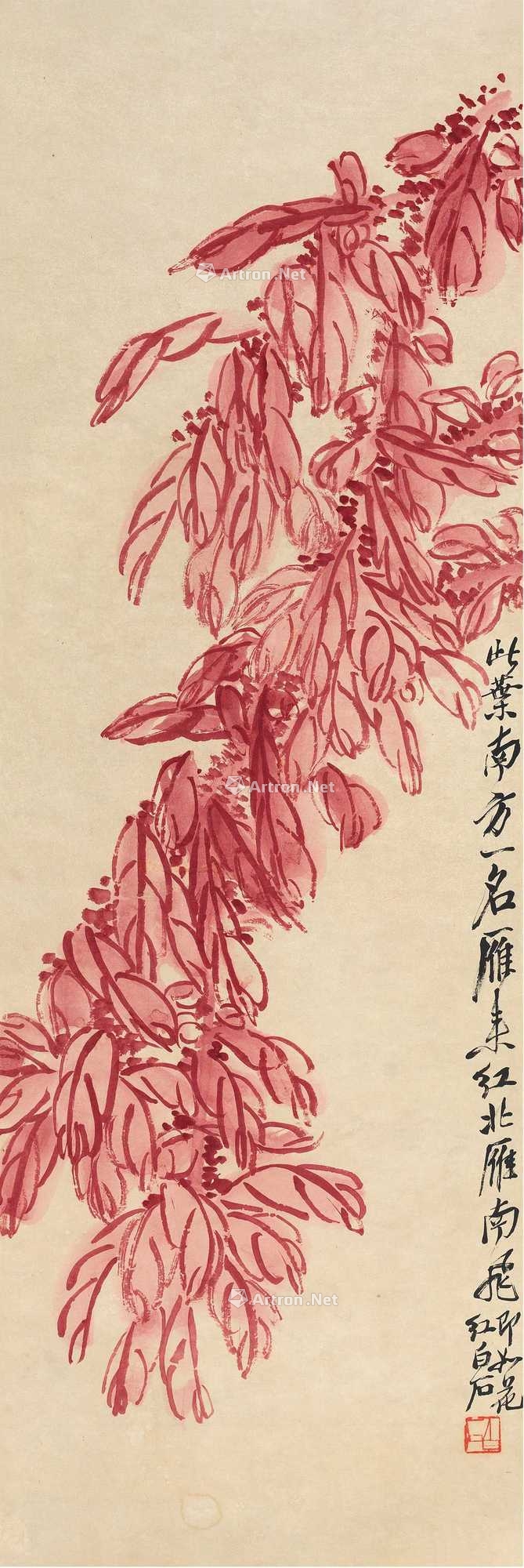 款识:此叶南方一名雁来红,北雁南飞即如花红。白石。