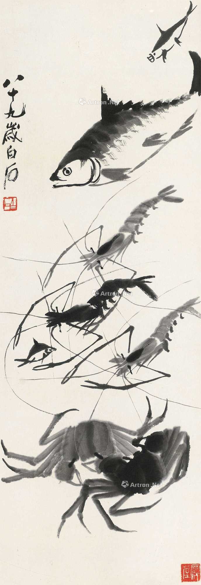 齐白石八十九岁(约1943年)所作的《水族图》,是其艺术完全成熟、返璞归真的典范之作。此时,他将毕生对水族生物的观察与感悟,化为了笔下天真烂漫、妙趣横生的笔墨交响。八十九岁的齐白石画虾已入化境,以极简的淡墨画出头部,一笔下去,浓淡深浅,既表现体积,又呈现透明质感。再用稍重的墨点出头部尖端的坚硬部分。虾身的节与节之间似断似连,腹部节肢的用笔富有弹性,将虾在水中游动时一伸一缩的动态表现得淋漓尽致。须与足的妙笔:虾须、虾足以细劲而富有弹性的线条画出,柔中带刚,看似随意,实则每一根的方向、弧度都经过精心经营,不仅表现了虾的灵动,更起到了组织画面、引导视线的作用。画蟹壳用泼墨法,一笔而成,墨色变化丰富;蟹腿以竖三笔画出,棱角分明,展现了蟹的硬壳质感;蟹钳张开,动态十足,充满力量。鱼的用笔更为简练,以淡墨画出鱼身,略点浓墨为睛和鳍,鱼儿游弋的姿态便跃然纸上。 画面大量留白,不画一滴水,却通过水族生物的动态、方向和组合, 让观者感受到满纸是水,意境空灵而深远。虾、蟹、鱼等的组合疏密有致,前后呼应,形成一个和谐的整体,仿佛描绘了一个热闹而有序的水底世界。