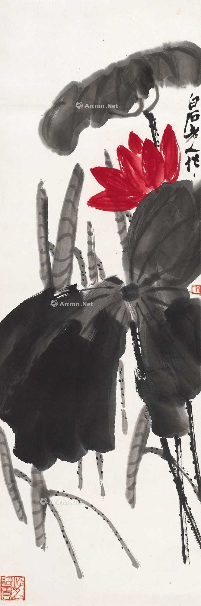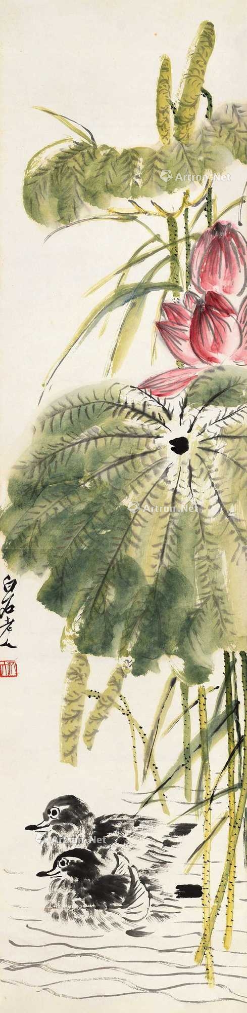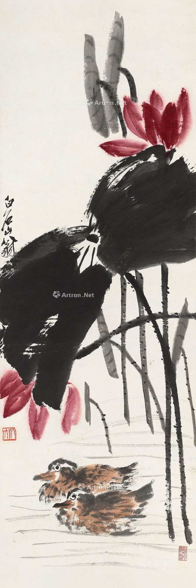 荷塘中淡墨的水纹,线条与荷梗交错,鸳意游于池中,相当和谐自在,鸳鸯的成双意象既反映传统婚姻观,亦隐含对和谐人际关像的向往,突破文人画孤高冷逸的传统。此题材作品多创作于白石老人晚年(1930-1950年代),现存市场有纪录者仅 20 余幅,如1939 年所作四尺整纸《红荷鸳鸯》以 342万 2,000 港元成交,显示市场对此艺术画题与其成就的认可。