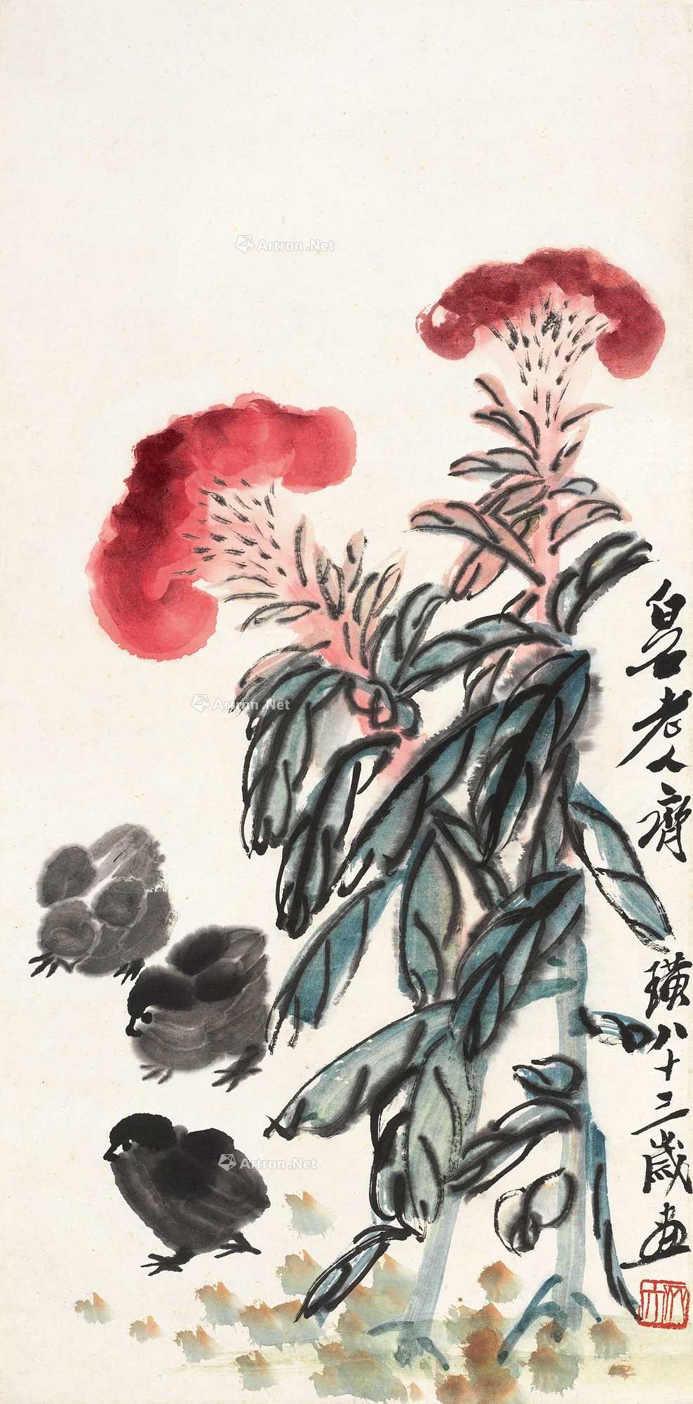 鸡冠花因其花形似鸡冠、颜色如火,民间赋予其“功成名就”、“高冠登榜”的吉祥寓意。同时,它也是农家院落最常见的花卉,是齐白 石深厚的乡土情结的载体。小鸡象征“多子多福”、“生命繁衍”,更承载着画家对童年牧耕生活的温暖回忆。他曾说“余日来画小鸡毛 茸茸,甚可爱”,笔下的小鸡充满了纯真的情感。鸡冠花与小鸡的组合,巧妙利用了名称上的关联,营造出一个和谐而充满生机的农家庭院场景,是对安宁、丰饶的田园生活最动人的赞歌。