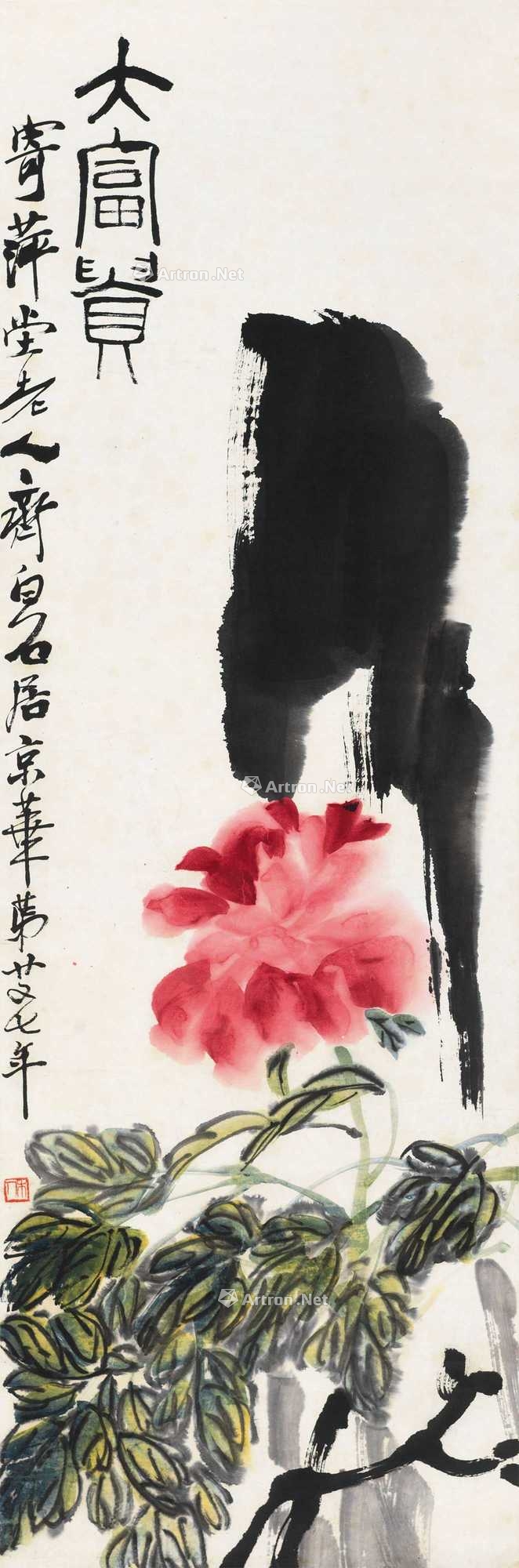 此幅《大富贵》牡丹以鲜艳的西洋红或胭脂点染花瓣,色彩浓烈饱满, 牡丹叶以泼墨法大笔写出,墨色淋漓,通过浓淡变化表现叶片的翻卷与 向背,笔法奔放不羁。寿石以重墨挥写,墨色沉厚,很好地压住了浓烈 的红色,使画面在鲜艳中不失稳重,构成了经典的“红花墨石”格局。《大富贵》是一场用最热烈的色彩与最浑厚的墨色奏响的生命交响乐。 它摒弃了矫饰,以天真烂漫的笔调,直抒对美好生活最本真、最炽热的 渴望。在这“大富贵”的背后,我们看到的是一位艺术大师返璞归真的至高境界—将深刻的艺术修养化入朴素的祝福之中,成就了跨越雅俗的永恒魅力。
