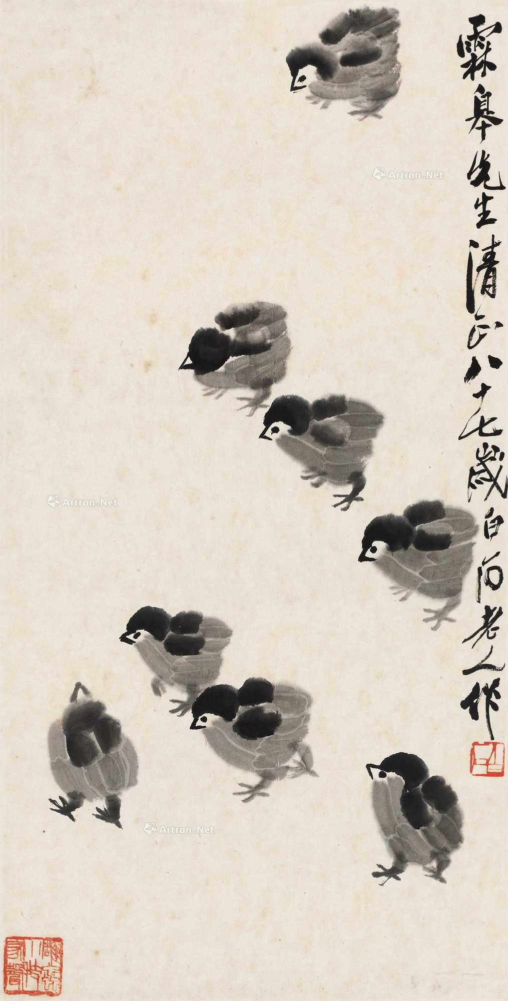 雏鸡是生活中所常见的,不论是在农村还是在城镇,只要有一小块地方便 可饲养。画面中这群活泼可爱、相互追逐的小鸡,就是日常生活中最普通的情景,画家却于其中发现了盎然的生活情趣,并把它生动的表现了出来。画面躁动喧闹,八只小鸡动态各异,相对或相向,注意力却集中于同一个没有具象焦点,此焦点可以是一条蚯蚓,可以是一只蚱蜢,抑或是……,正是因为没有画出具体的形象,更给赏者以无限遐想,正所谓“无声胜有声”。此画纯以水墨为之,蕴无穷变化于黑白之间。黑白灰的表现全在用水的控制上,水少则墨色干涩,不能很好的表现出雏鸡那毛茸茸的质感,水多则会使画面摊成一片,从图中可以看出画家对于水墨的控制已是相当的纯熟。笔墨毕竟是服务于形象的,白石老人笔下的雏鸡象一群稚拙天真而又顽皮的孩子,跑在最前面的生怕被别人追上,跟在后面的则是穷追不舍,最上面的那只此前似是在自娱自乐,刚得到消息,也不甘落后,远远的正欲扑楞着稚嫩的小翅飞奔而来。在构图上或两个一对,或三个一组,错落有序,小鸡从不同的方向追来,形“散”而神聚,无声而胜有声。