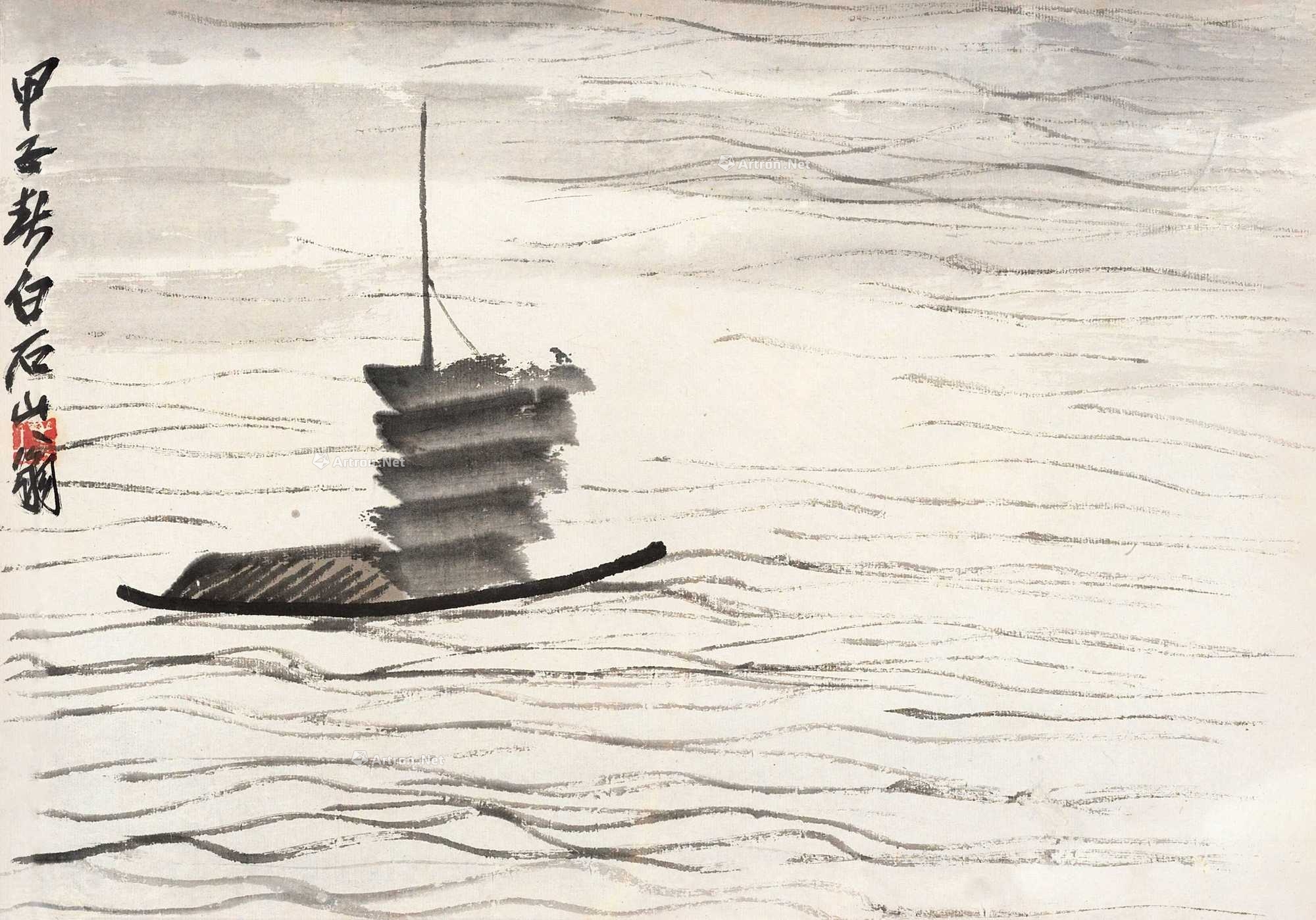 此幅《一帆风顺》画面主体仅有一艘帆船,帆面三五笔侧锋写出,迎风而行。船体以简练的墨线勾勒,形态质朴。水面以寥寥数笔 淡墨波纹表现,计白当黑,以虚代实,既突出了孤帆的主体地位,又给人以江天辽阔、前程万里的无限想象。构图采用对角线构图,帆船从画面左下角斜向驶出,极具动感和方向感,生动地诠释了“乘风破浪”的意境。对于一生历经坎坷、晚年方得大名的齐白石来说,“一帆风顺”不仅是对他人的祝福,也暗含了其个人的人生体悟:画面中洋溢的一往无前的气势,正是他坚韧不拔、始终对生活充满热情的性格写照。孤帆与阔水的对比,既暗喻了人生旅途的孤独与未知,更展现了一种顺应时势、把握方向的豁达与智慧。