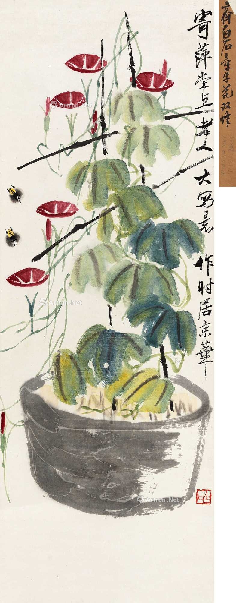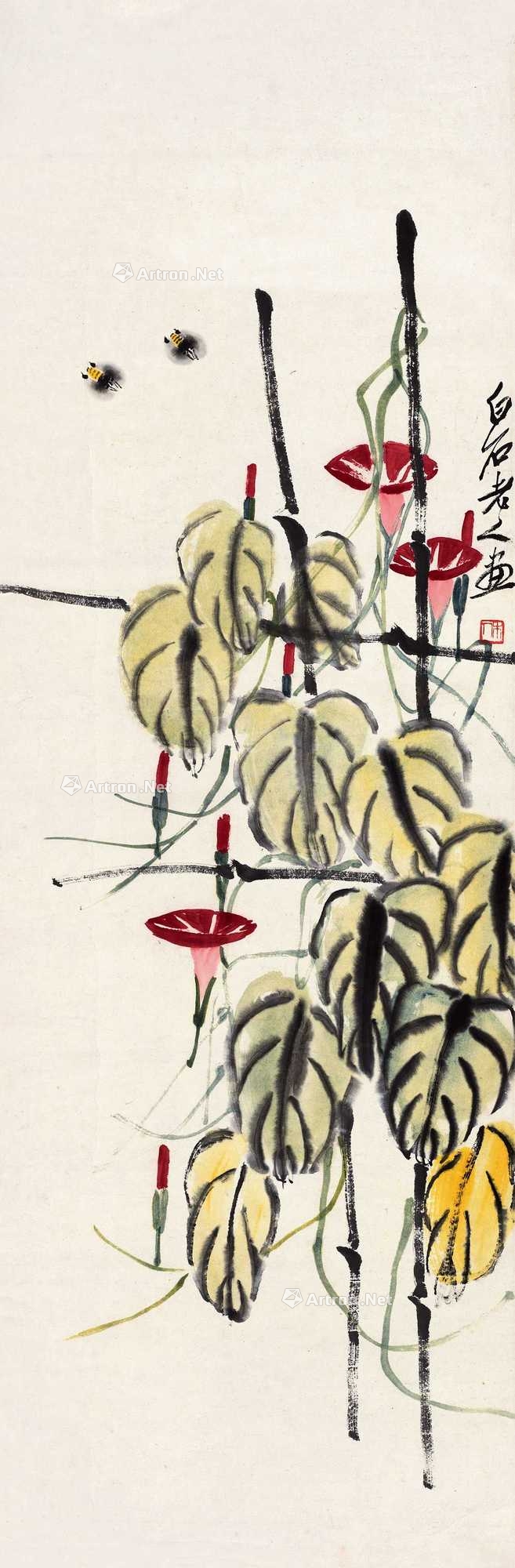 牵牛花是齐白石钟爱的题材之一,他自称“种牵牛花三百余本”,足见其深情。此花非传统文人画的“梅兰竹菊”,而是寻常百姓家常见的“喇叭花”,带有浓厚的乡土气息和质朴生命力。双蜂的“双”数在中国文化中有“成双成对”、“好事成双”的吉祥寓意。蜜蜂象征着勤劳与收获,其飞舞的“嗡嗡”声为静谧的画面注入了听觉上的动感与生机。盛开的牵牛花与忙碌的双蜂,共同构成了夏日清晨农家篱笆墙边最富生机的一角,充满了平淡天真的生活诗意。