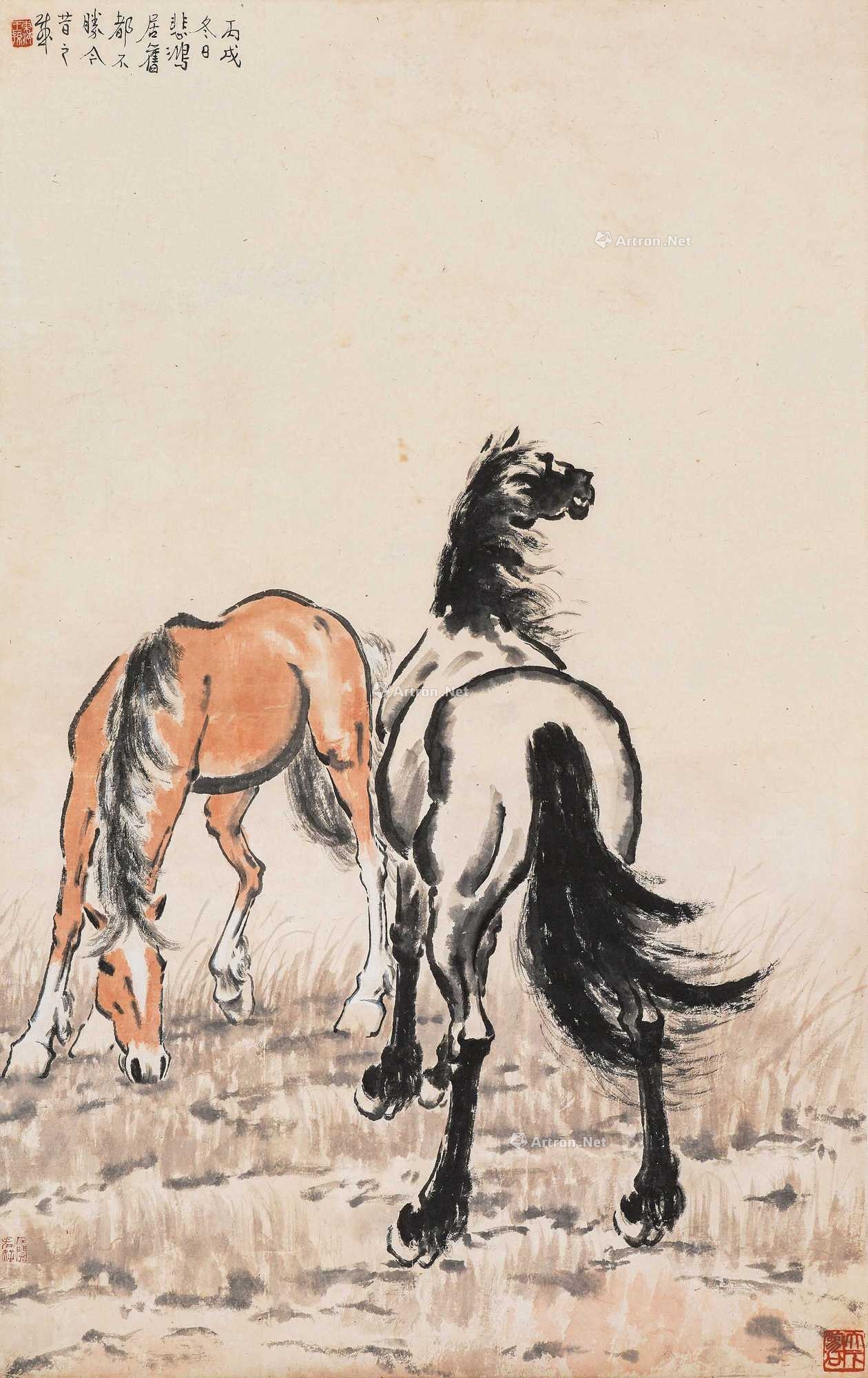 1946年是徐悲鸿艺术与人生的关键节点:时代语境:抗战刚胜利,内战又起,社会处于动荡与希望的交织期;徐悲鸿时任北平艺专校长,在新旧环境的更迭中感慨“不胜今昔之感”。情感寄托:题跋“丙戌冬日悲鸿旧居,不胜今昔之感”,既暗含对过往岁月的回望,也以双骏的安然姿态,寄托对和平、友爱的期盼。